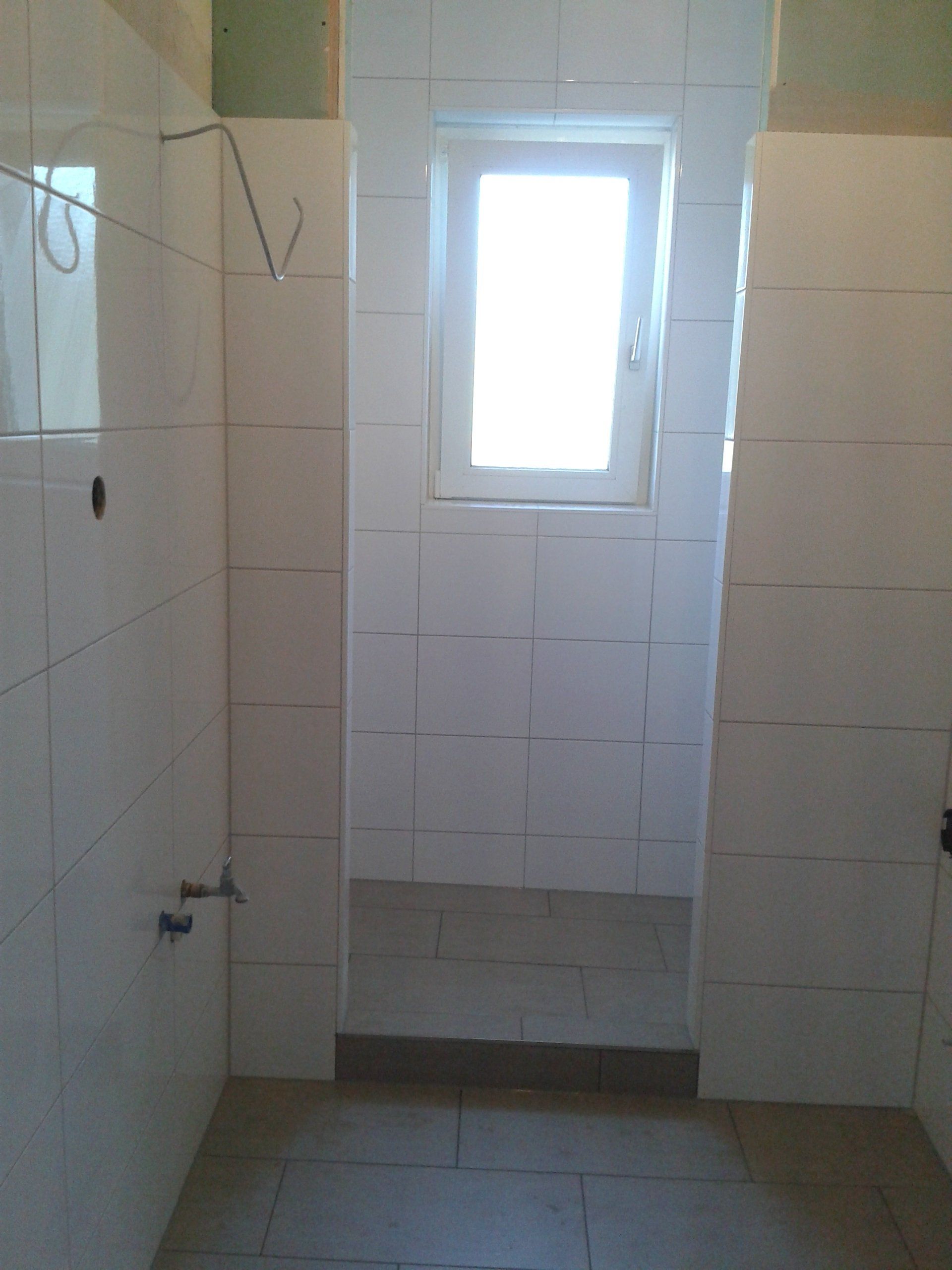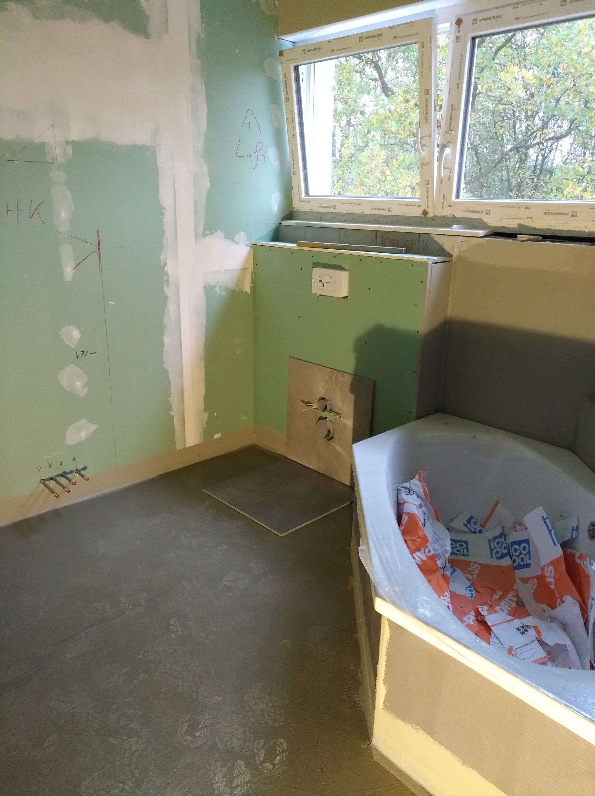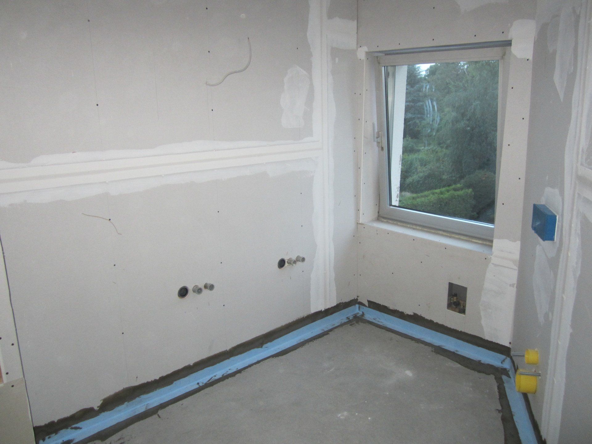 Bei dieser Badsanierung in einem Mietobjekt in Hamm wurde die Badewanne vor dem Fenster durch eine Duschrinne ersetzt. Der Monteur trennte den Duschbereich mittels einer Rigipswand vom Raum ab ( Glastür kam später hinzu). Da wie so oft in Altbauten der niedrige Estrichaufbau nicht für eine ebenerdige Ausführung ausreichend ist haben wir einen Estrich im Duschbereich eingebaut der mit noch ausreichendem Gefälle zum Ablauf eine möglichst kleine Stufe in die neue Dusche ausbildet.