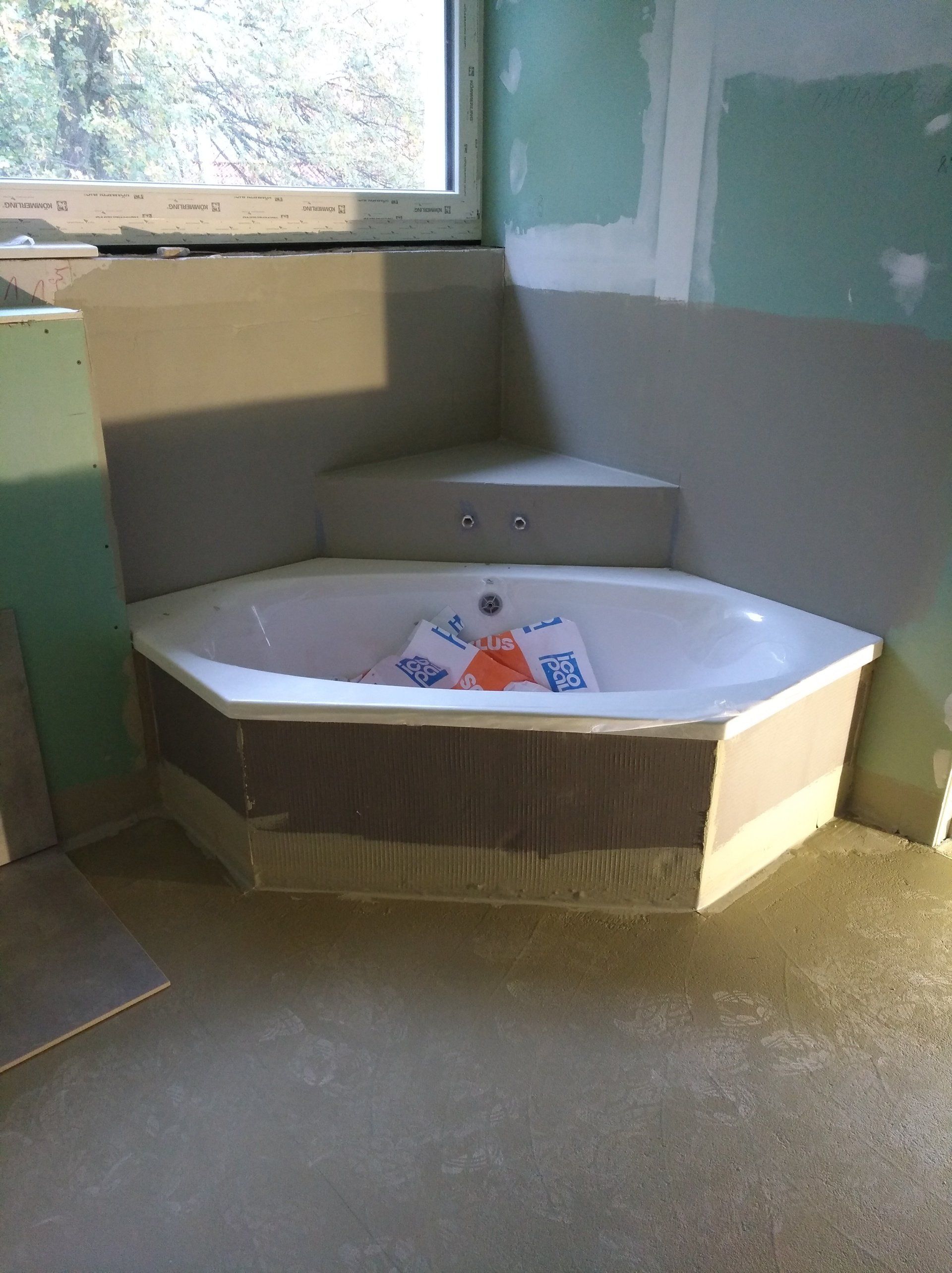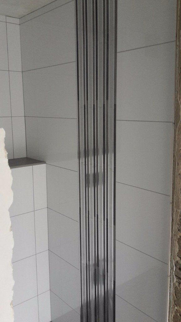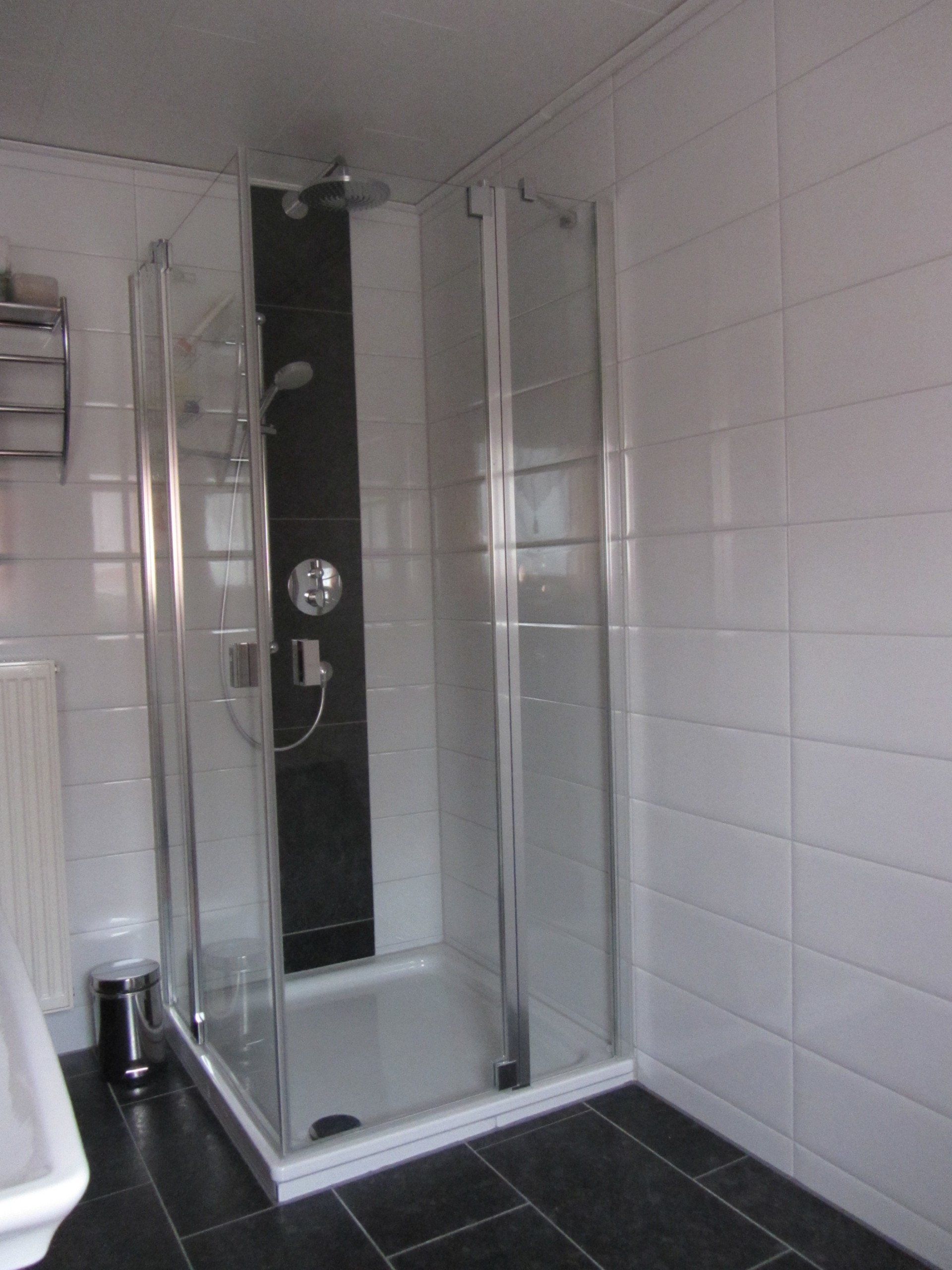 Bei dieser Badsanierung in einem Mietobjekt in Hamm wurde die Badewanne vor dem Fenster durch eine Duschrinne ersetzt. Der Monteur trennte den Duschbereich mittels einer Rigipswand vom Raum ab ( Glastür kam später hinzu). Da wie so oft in Altbauten der niedrige Estrichaufbau nicht für eine ebenerdige Ausführung ausreichend ist haben wir einen Estrich im Duschbereich eingebaut der mit noch ausreichendem Gefälle zum Ablauf eine möglichst kleine Stufe in die neue Dusche ausbildet.