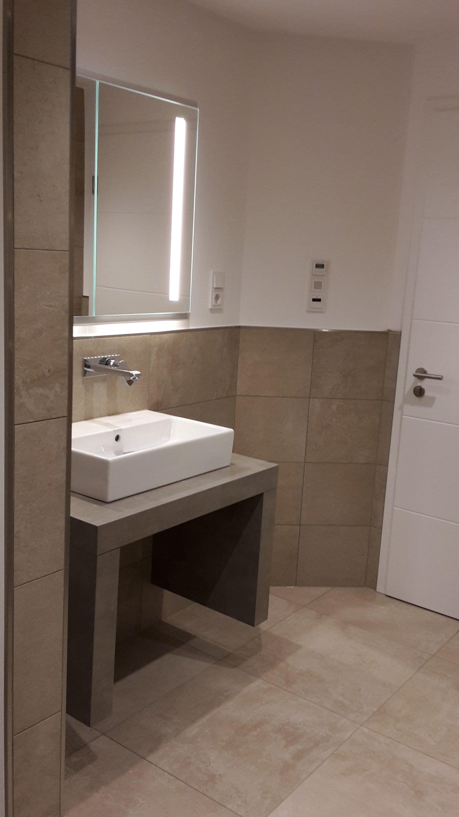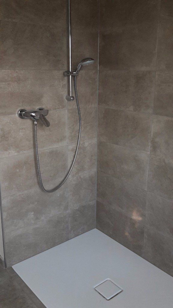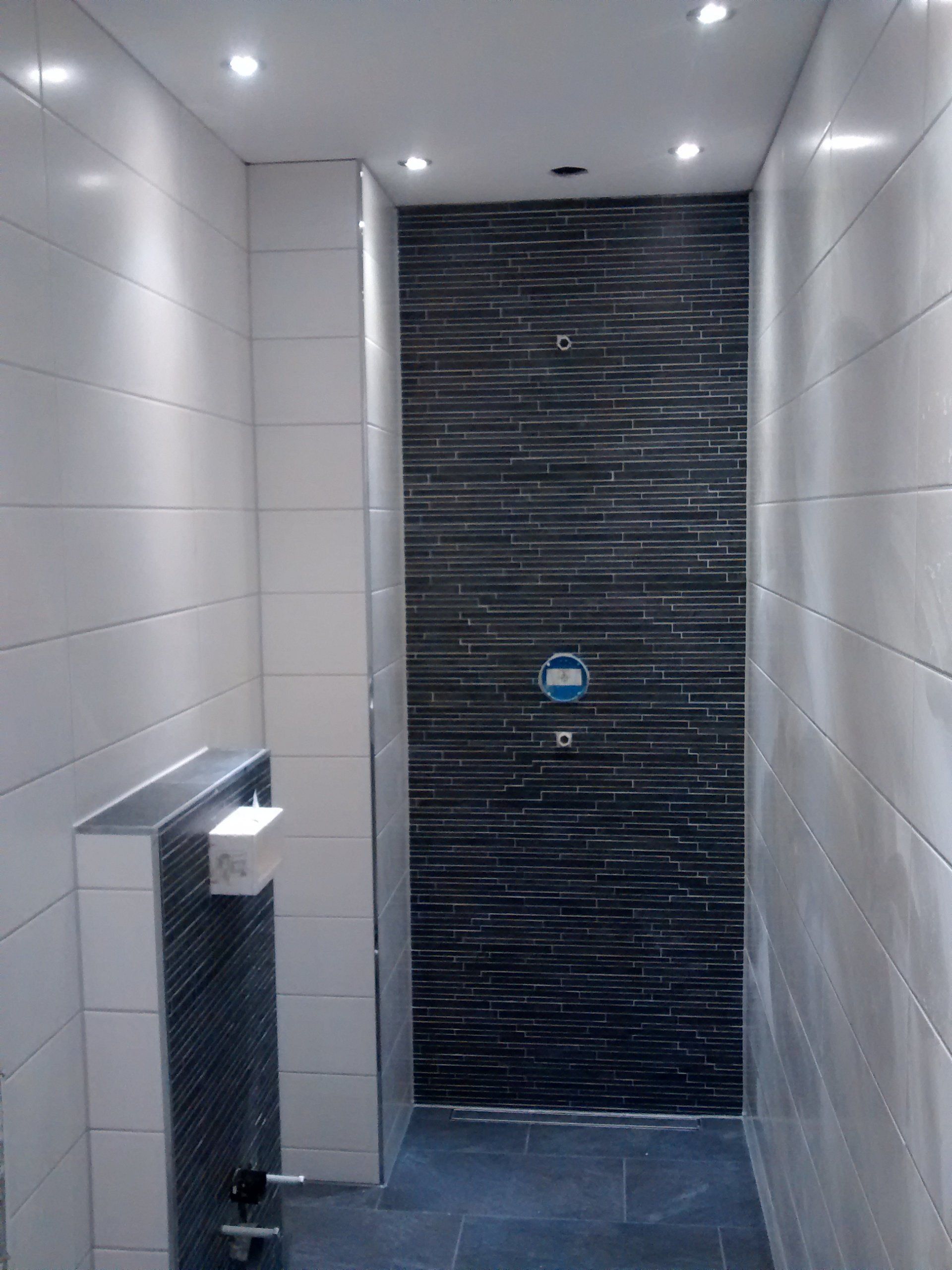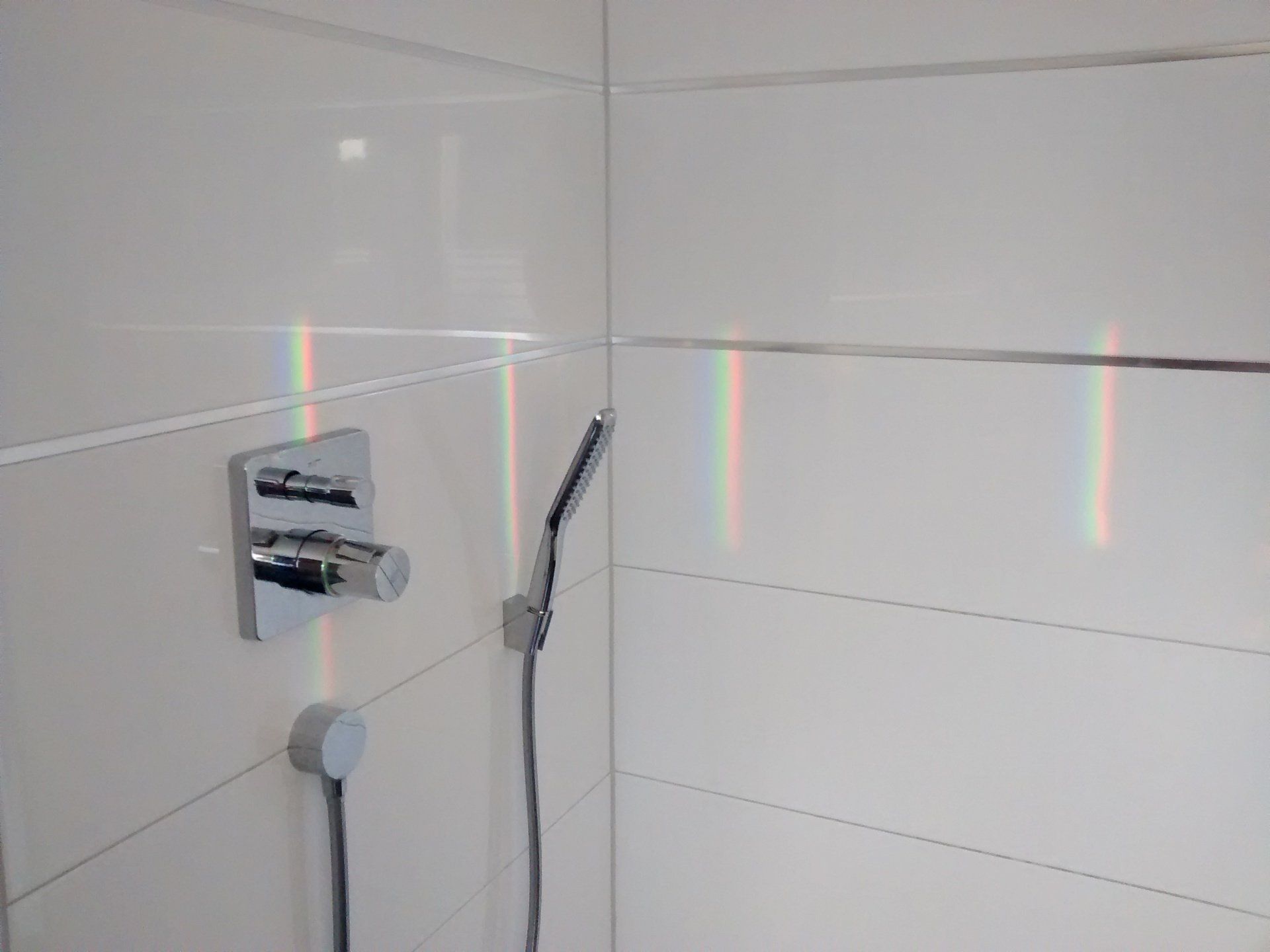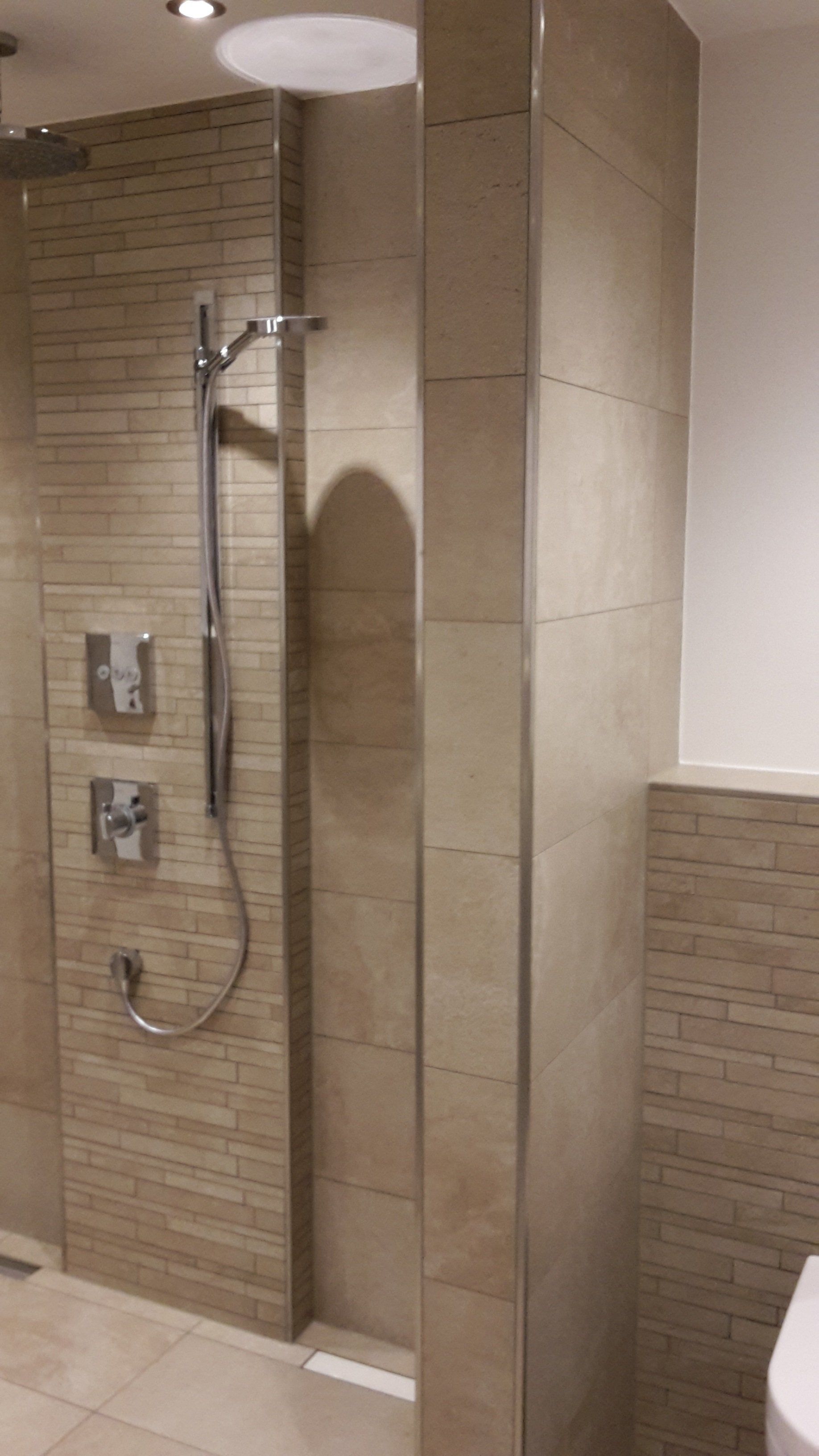Fliesenarbeiten in Norderney. Es wurde in einem Apartmenthaus das gesamte Erdgeschoss modernisiert und von uns in diesem Zusammenhang die Fliesenarbeiten in den 2 Bädern und dem Flur / Eingangsbereich ausgeführt. Der Flur hatte durch verschiedene Höhen angrenzender Räumlichkeiten in vielen Bereichen unterschiedlich starkes Gefälle was im Zusammenhang mit den großen Bodenfliesen und den schräg verbauten Revisionsschächten die Arbeiten erschwerten.