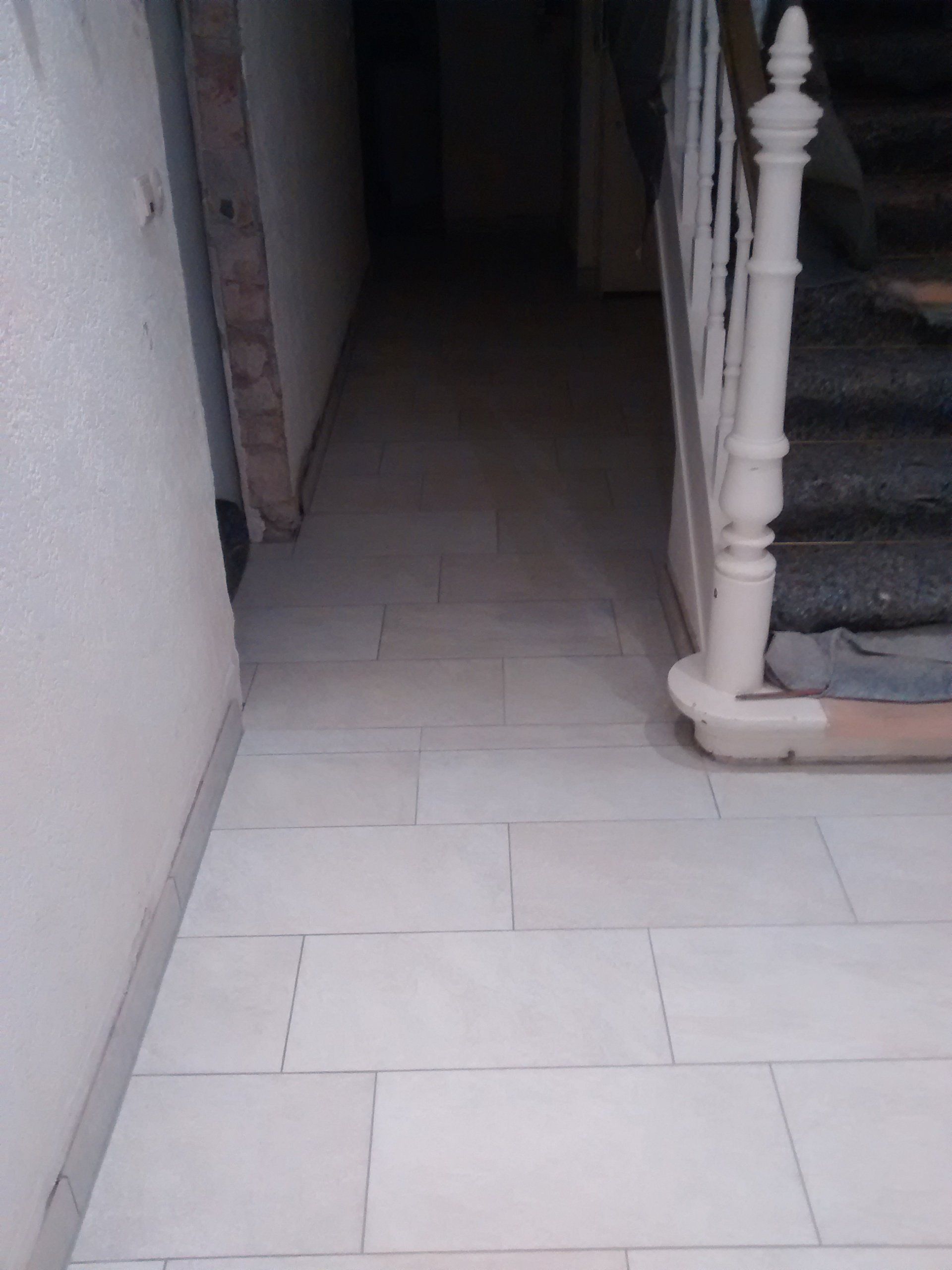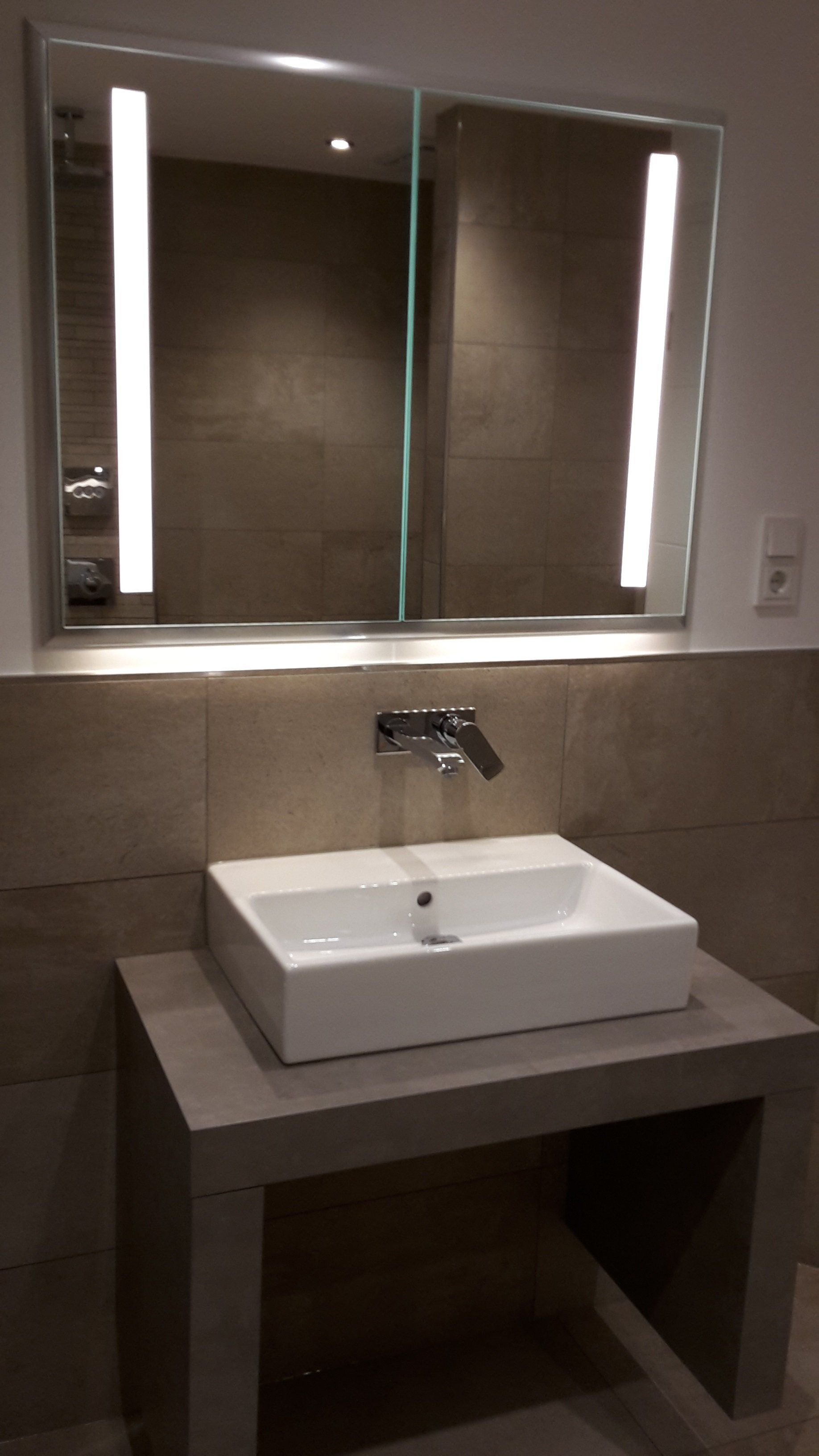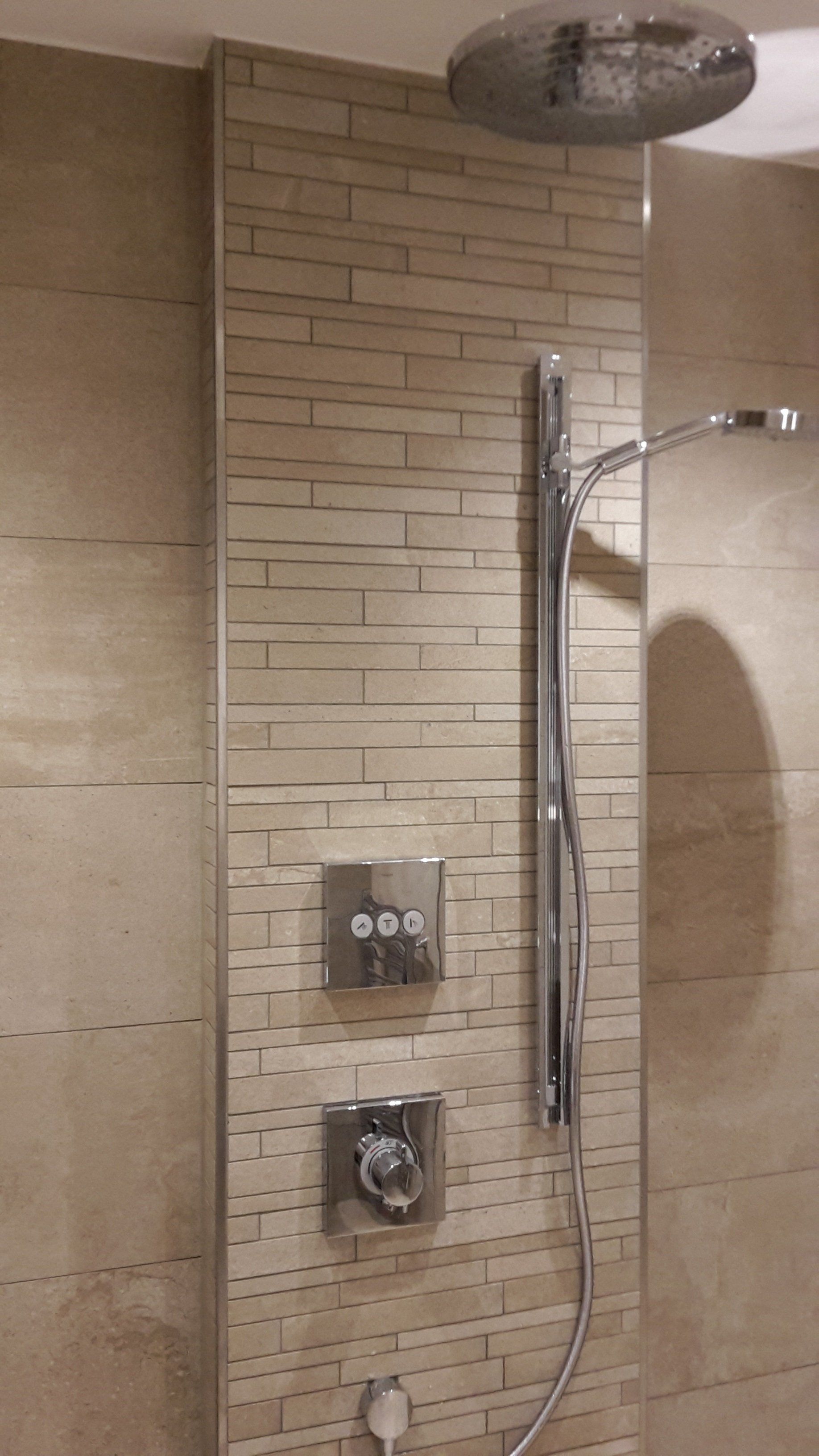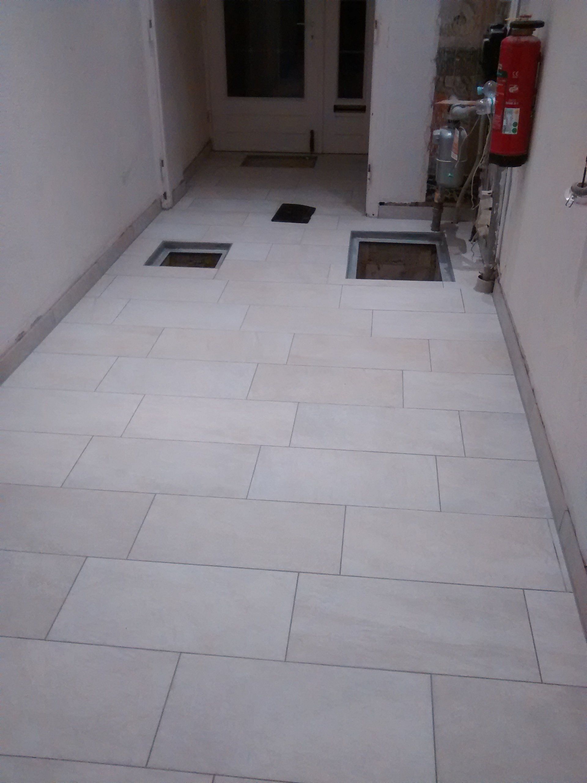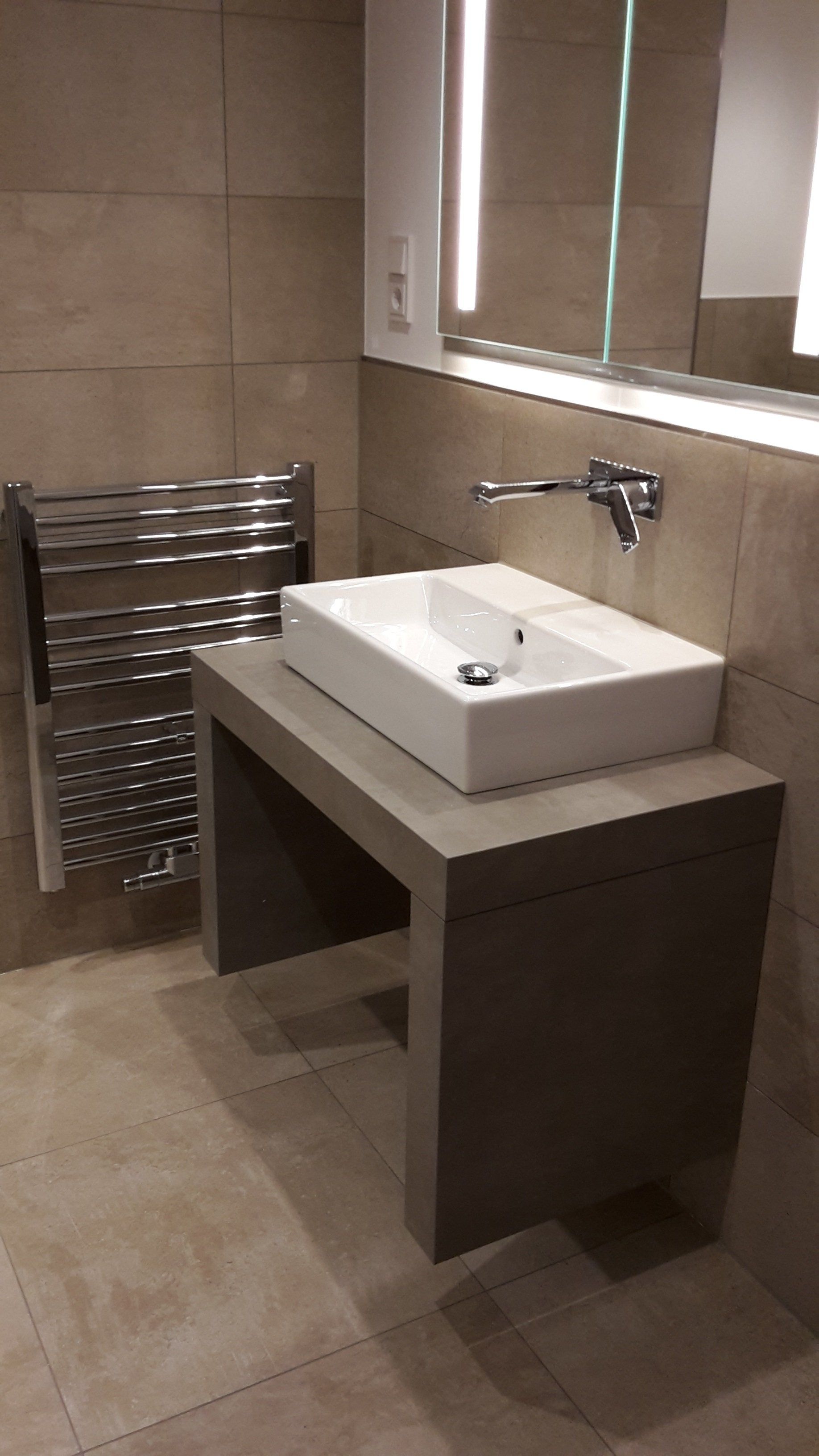 Fliesenarbeiten in Norderney. Es wurde in einem Apartmenthaus das gesamte Erdgeschoss modernisiert und von uns in diesem Zusammenhang die Fliesenarbeiten in den 2 Bädern und dem Flur / Eingangsbereich ausgeführt. Der Flur hatte durch verschiedene Höhen angrenzender Räumlichkeiten in vielen Bereichen unterschiedlich starkes Gefälle was im Zusammenhang mit den großen Bodenfliesen und den schräg verbauten Revisionsschächten die Arbeiten erschwerten.