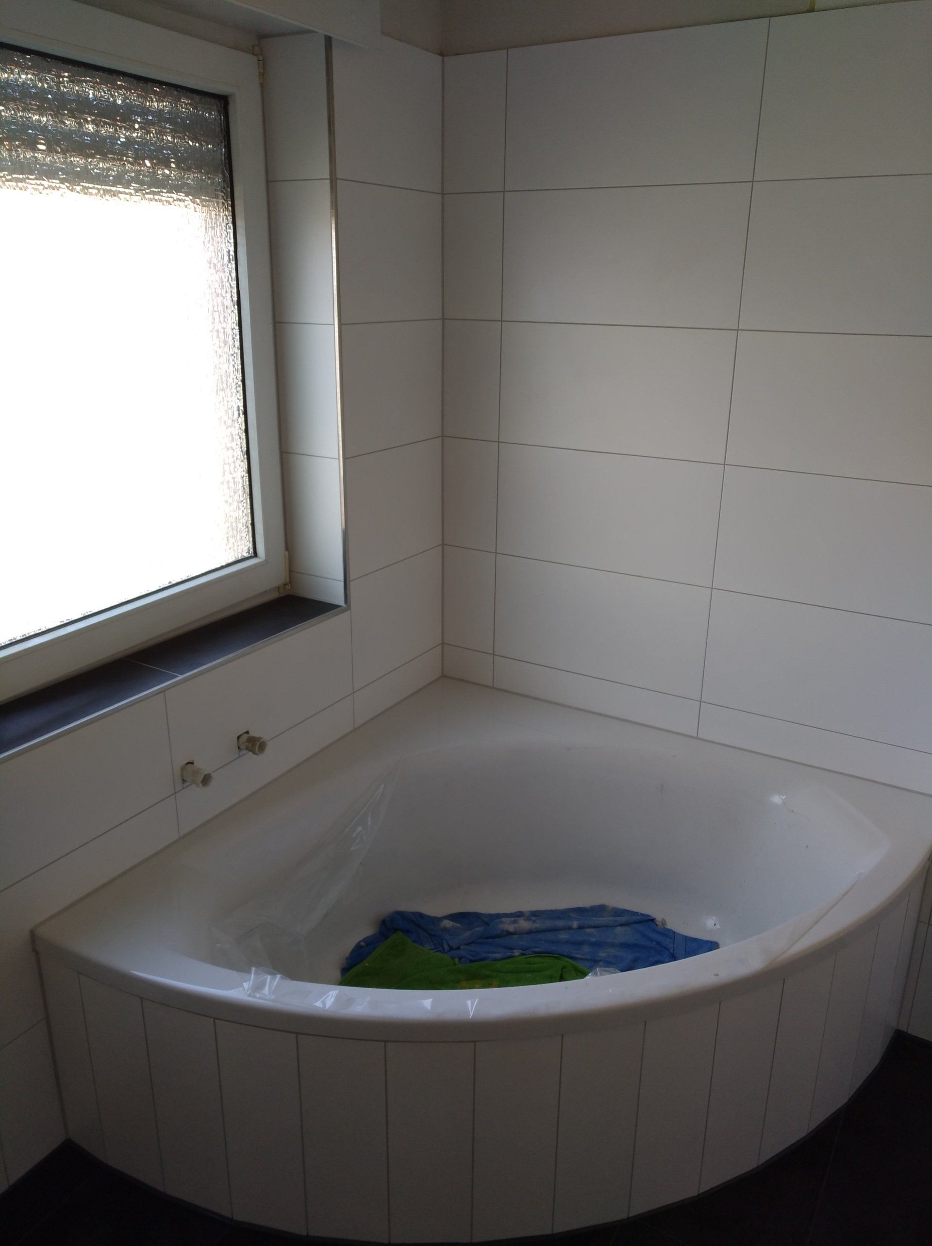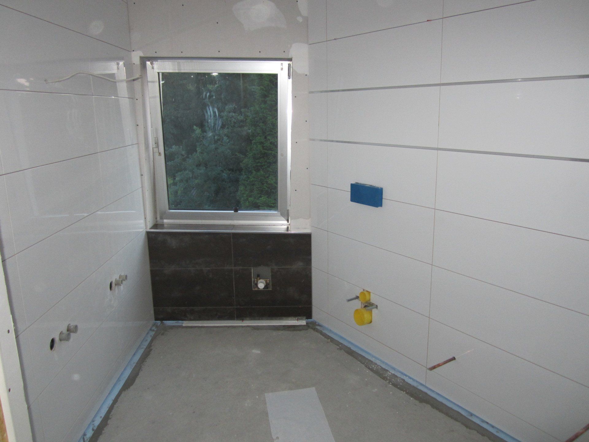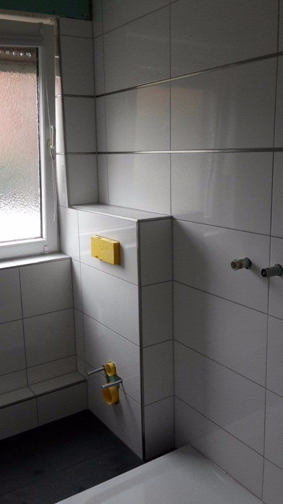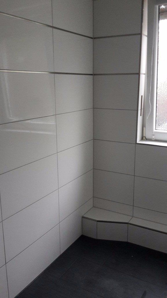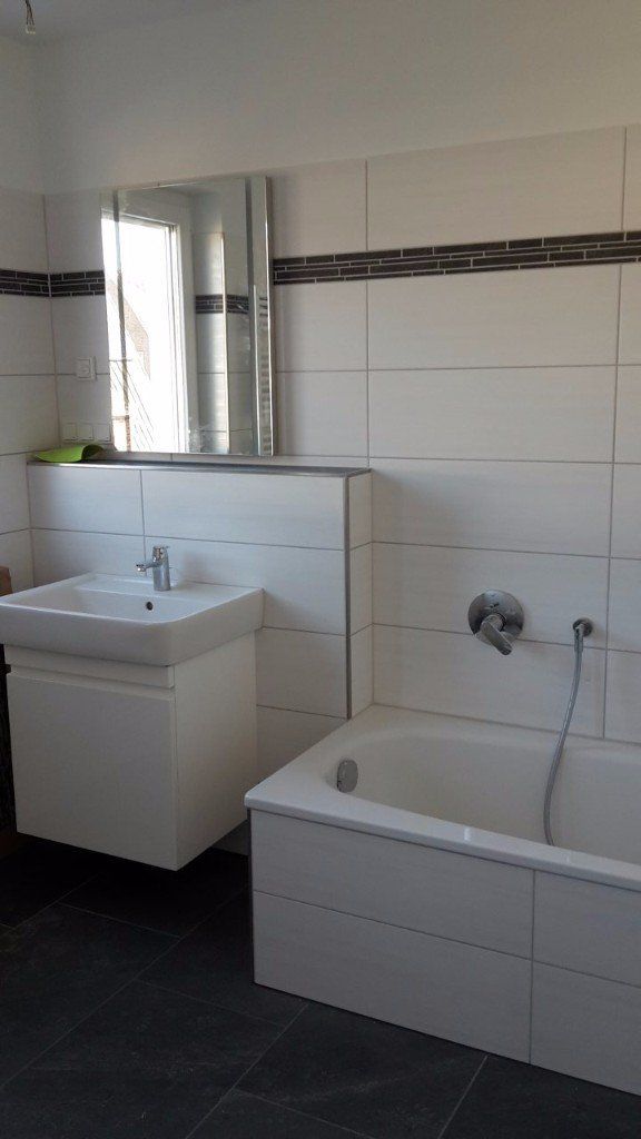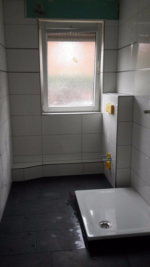 Hier wurde in einer stark bergbaugeschädigten Doppelhaushälfte das Badezimmer im Obergeschoss auf einer Holzbalkendecke komplett neu gestaltet. Das Resultat ist ein modernes Badezimmer mit ebenerdiger Dusche und geraden Wänden und Boden. Das Fenster wurde im Ursprungszustand belassen um die Außenansicht des Hauses nicht zu beeinträchtigen.