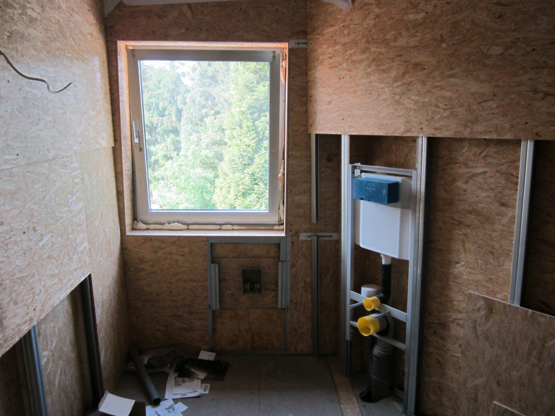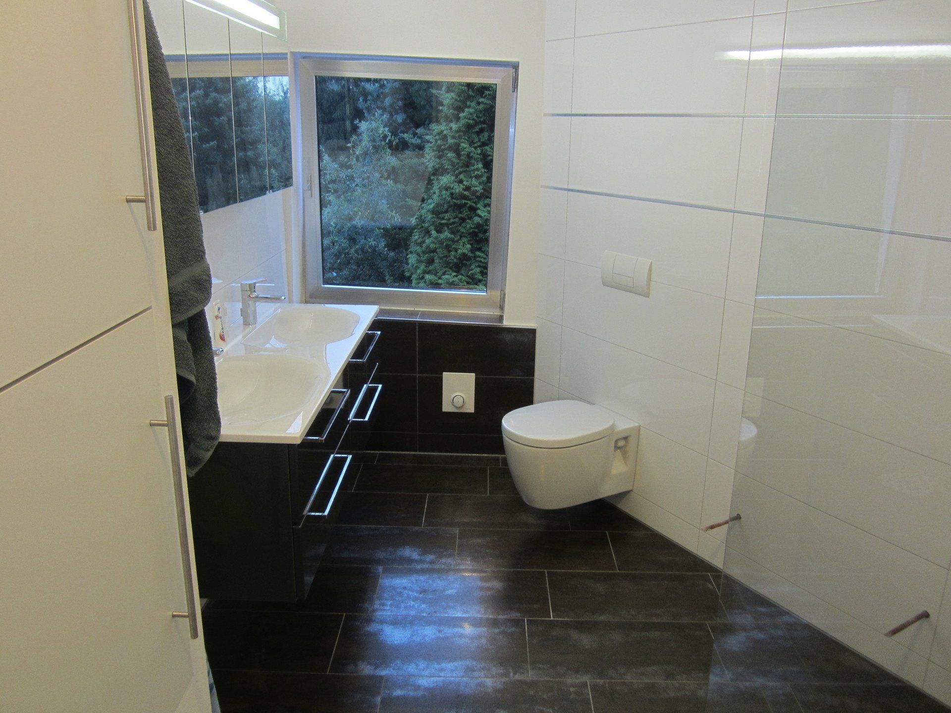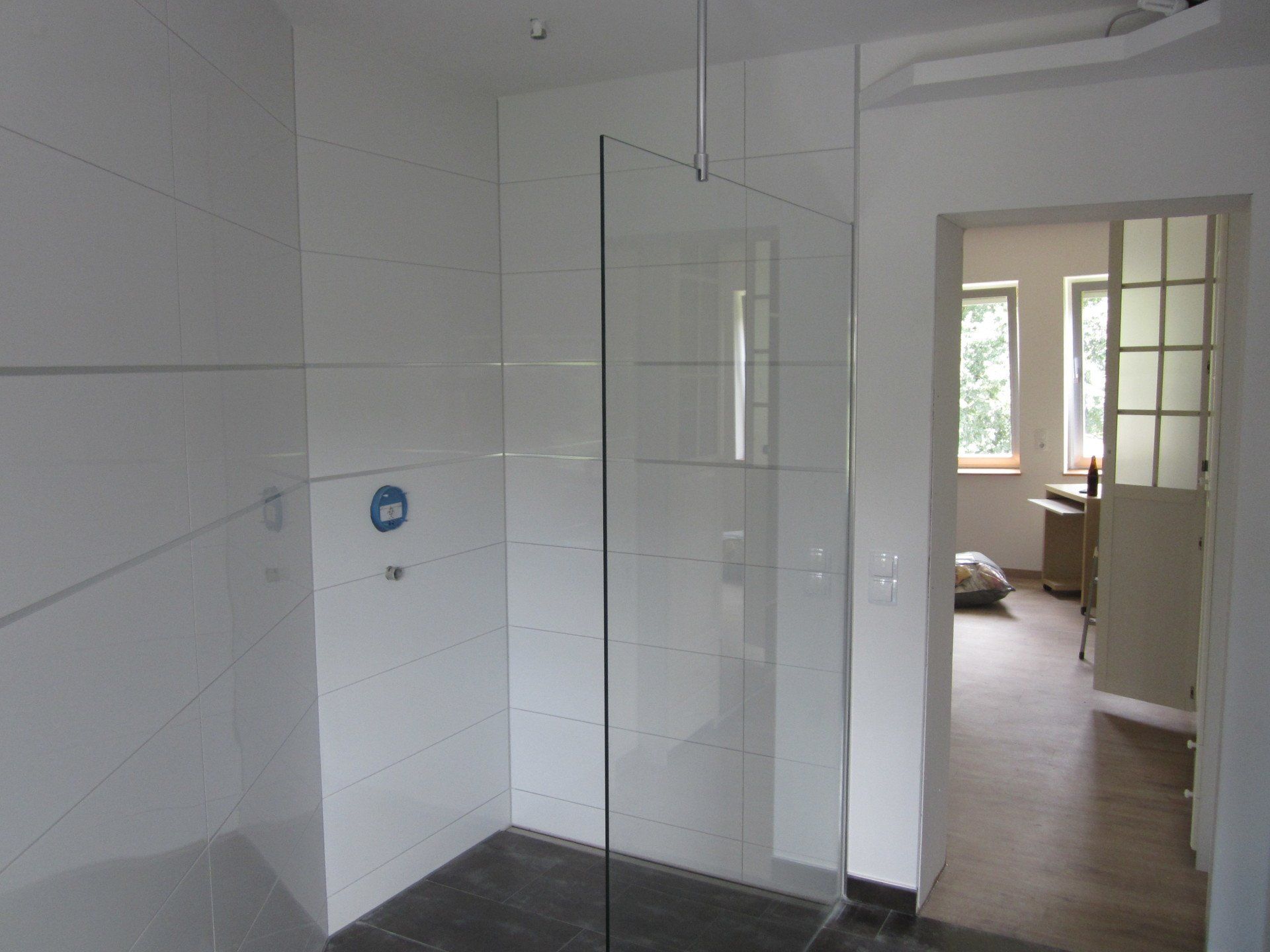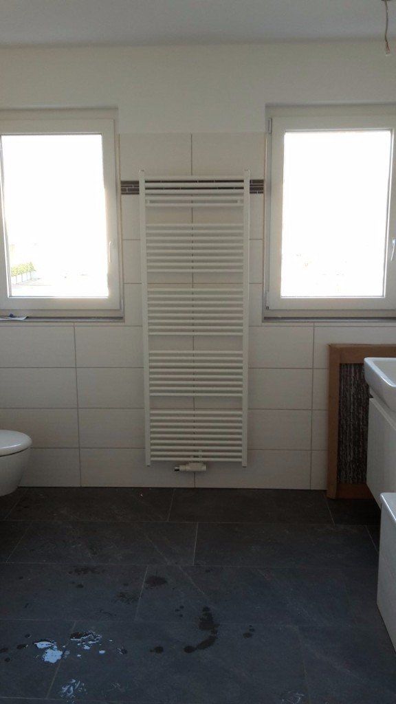 Hier wurde in einer stark bergbaugeschädigten Doppelhaushälfte das Badezimmer im Obergeschoss auf einer Holzbalkendecke komplett neu gestaltet. Das Resultat ist ein modernes Badezimmer mit ebenerdiger Dusche und geraden Wänden und Boden. Das Fenster wurde im Ursprungszustand belassen um die Außenansicht des Hauses nicht zu beeinträchtigen.
