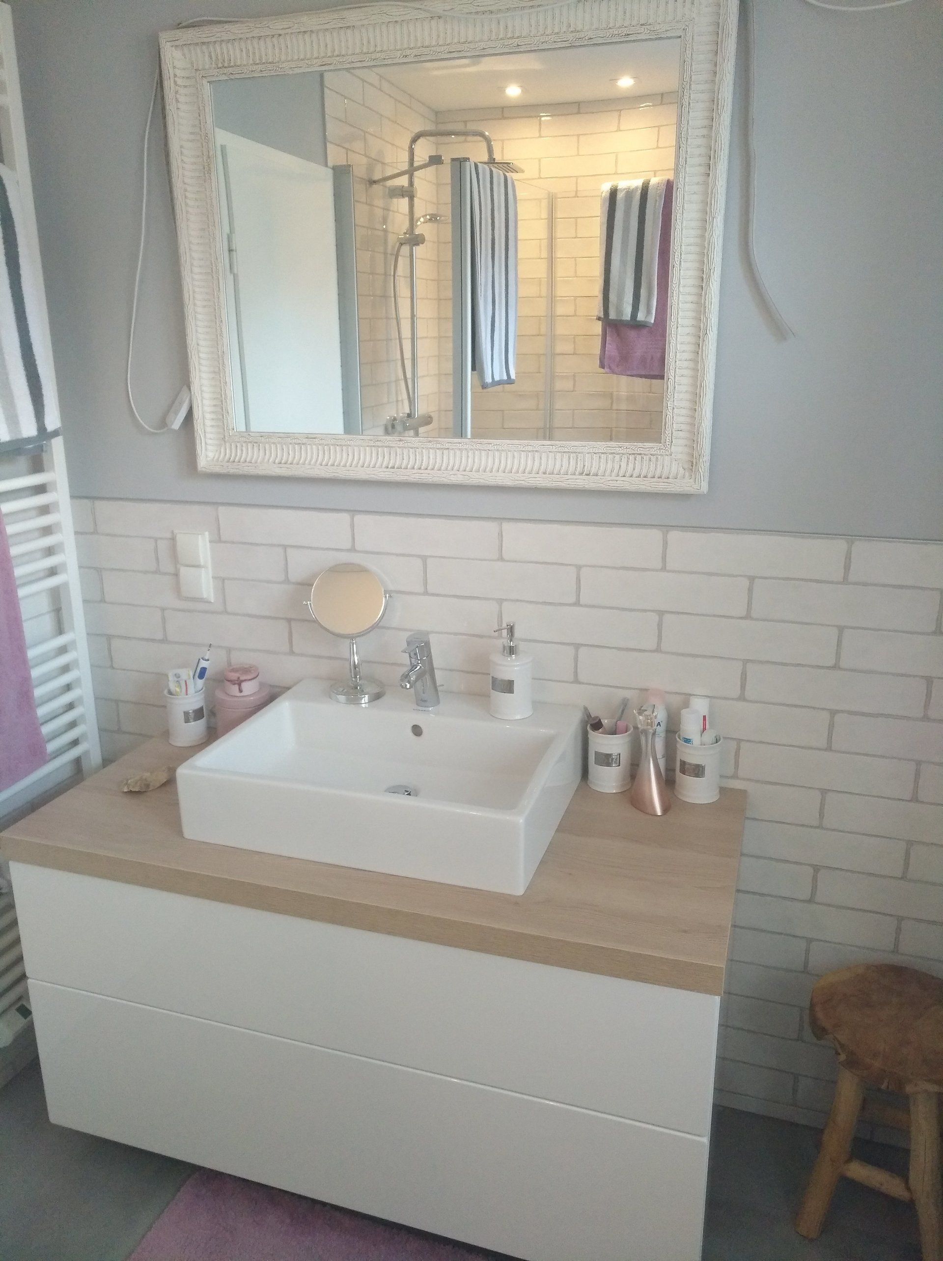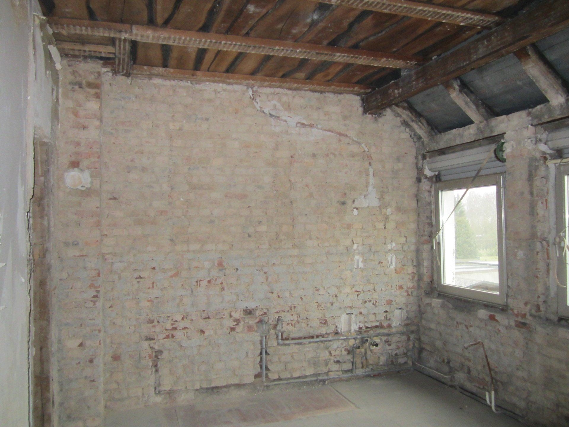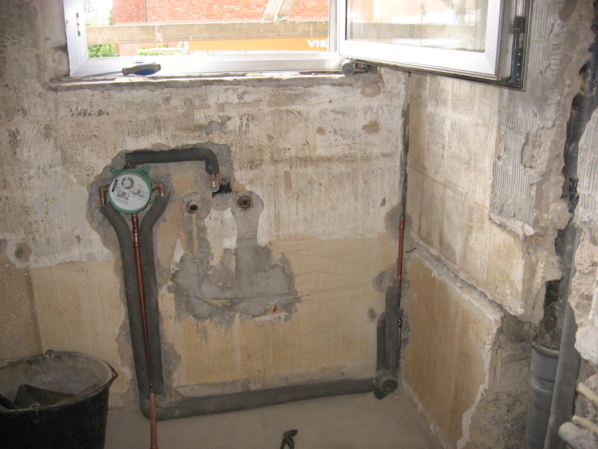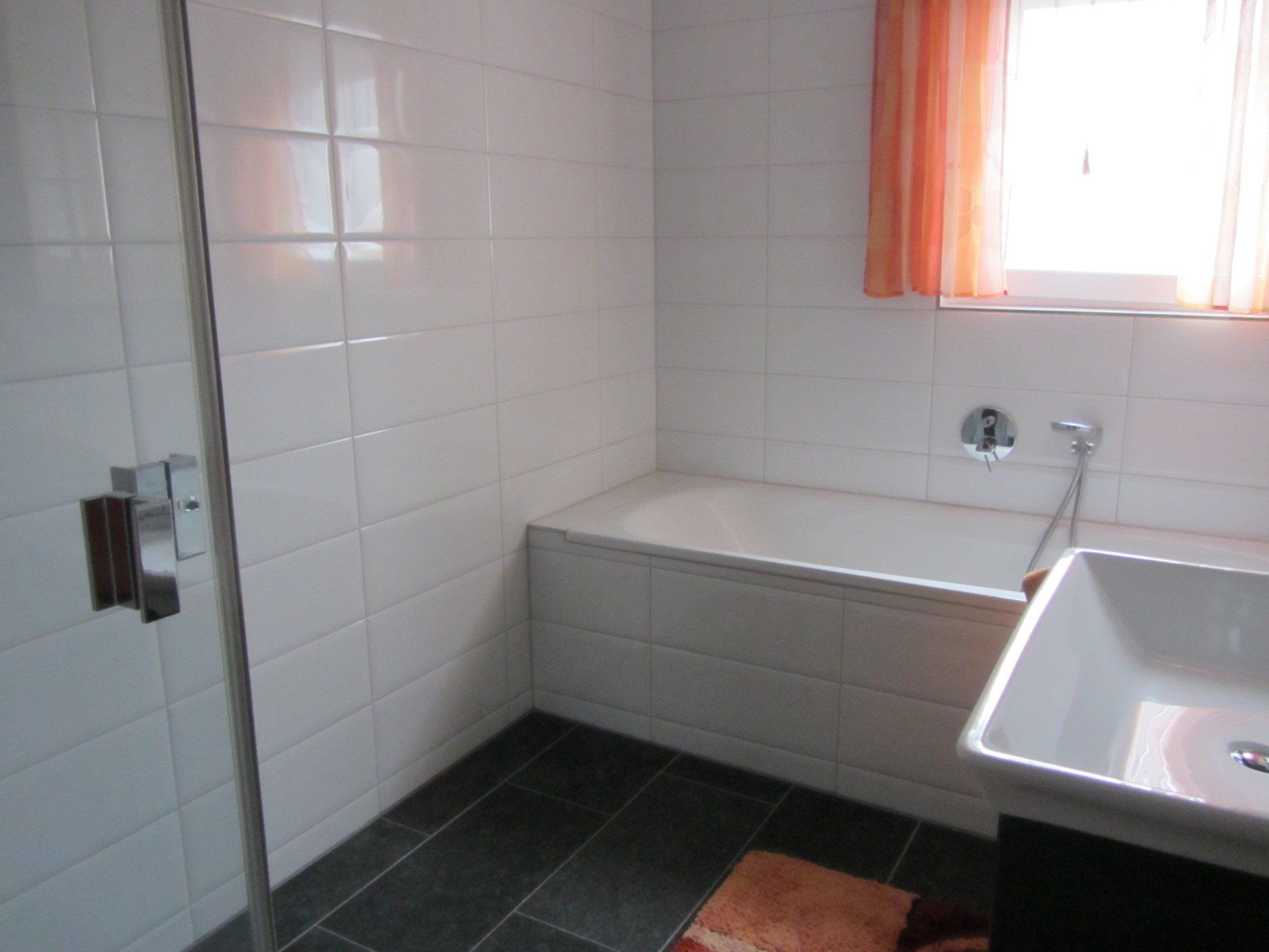 Hier wurde in einer stark bergbaugeschädigten Doppelhaushälfte das Badezimmer im Obergeschoss auf einer Holzbalkendecke komplett neu gestaltet. Das Resultat ist ein modernes Badezimmer mit ebenerdiger Dusche und geraden Wänden und Boden. Das Fenster wurde im Ursprungszustand belassen um die Außenansicht des Hauses nicht zu beeinträchtigen.