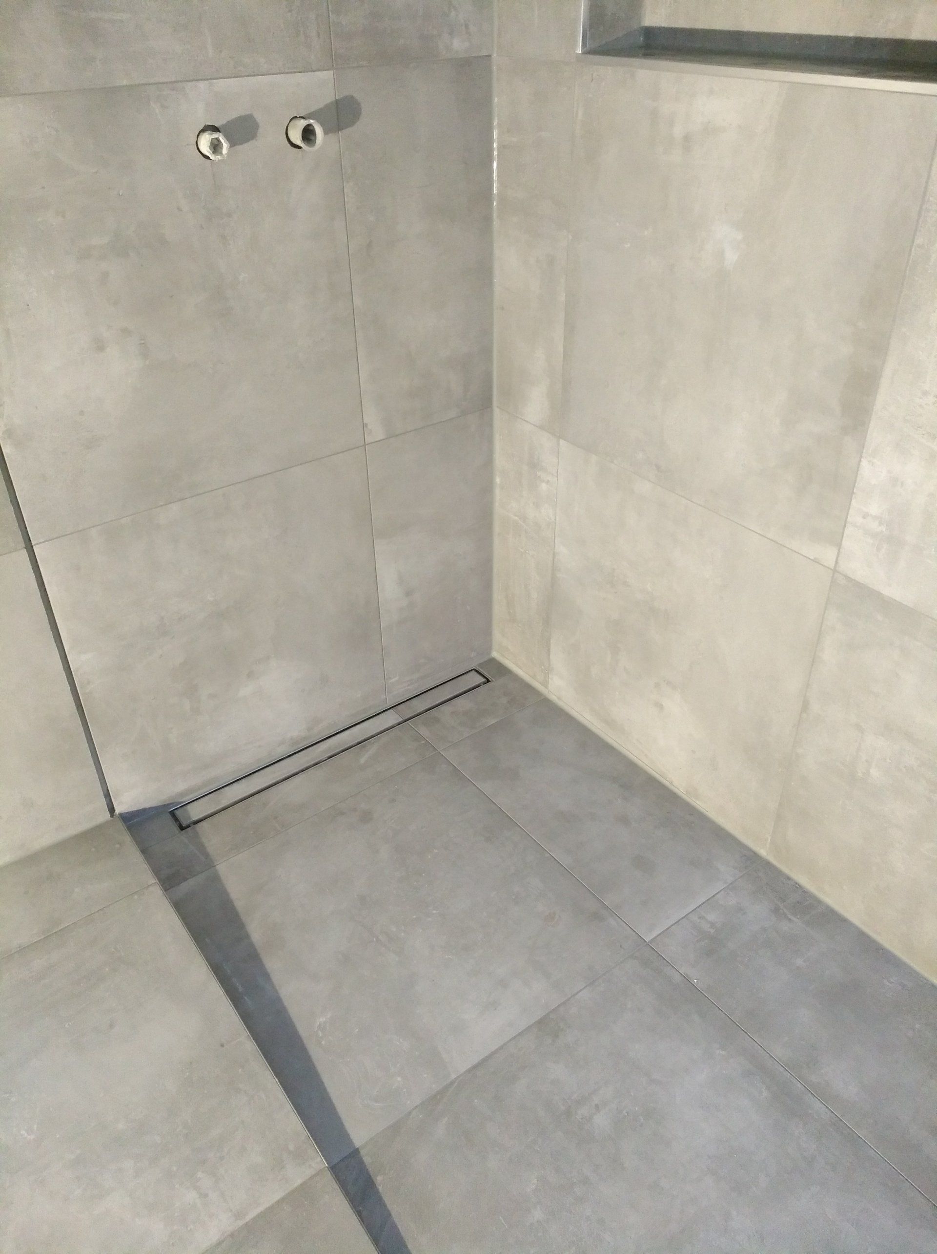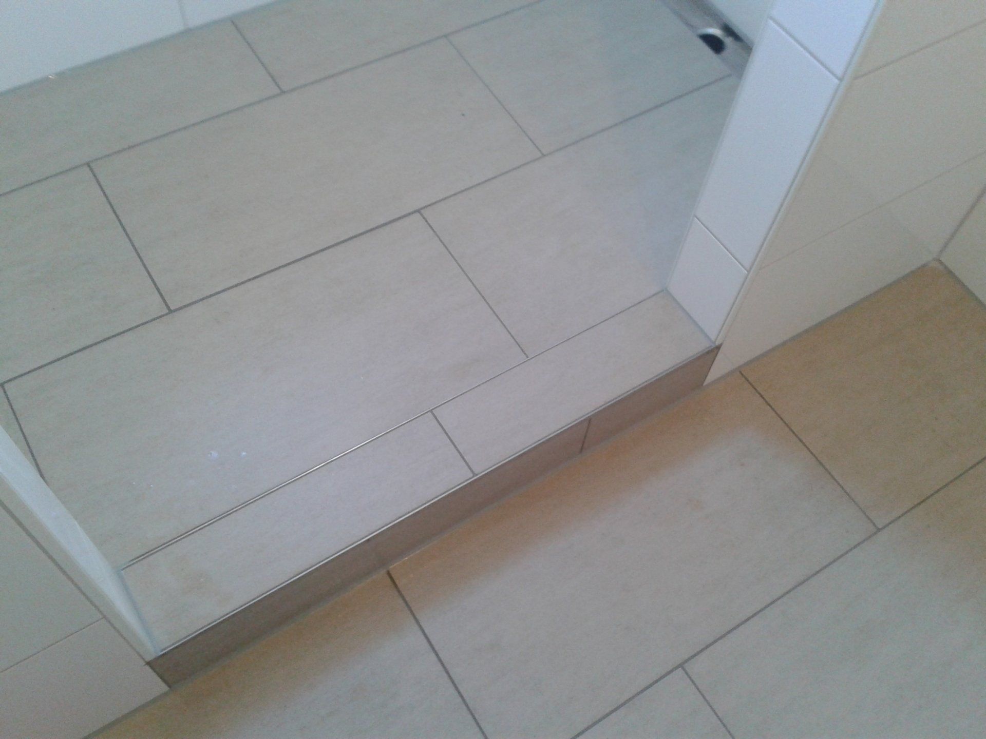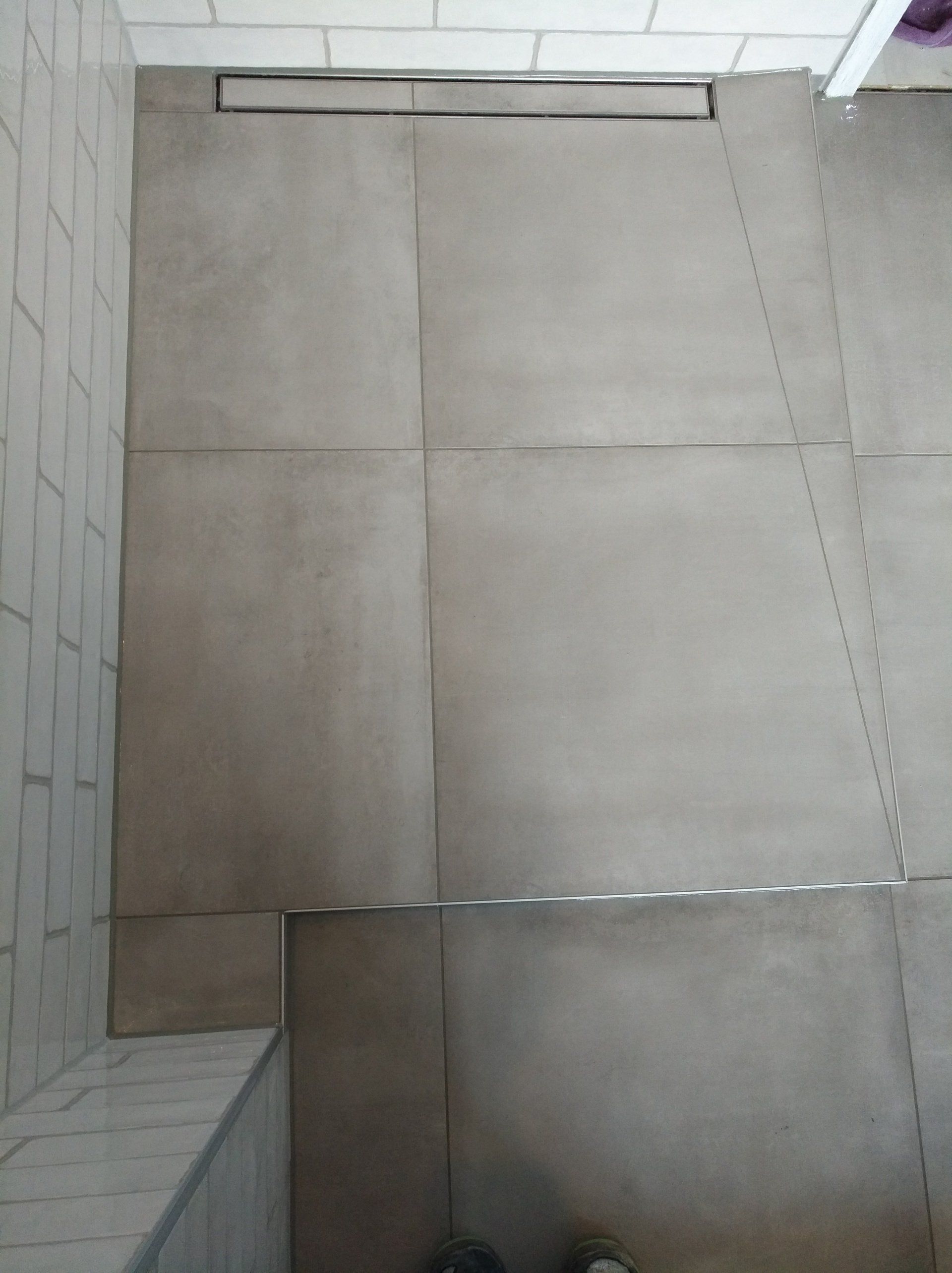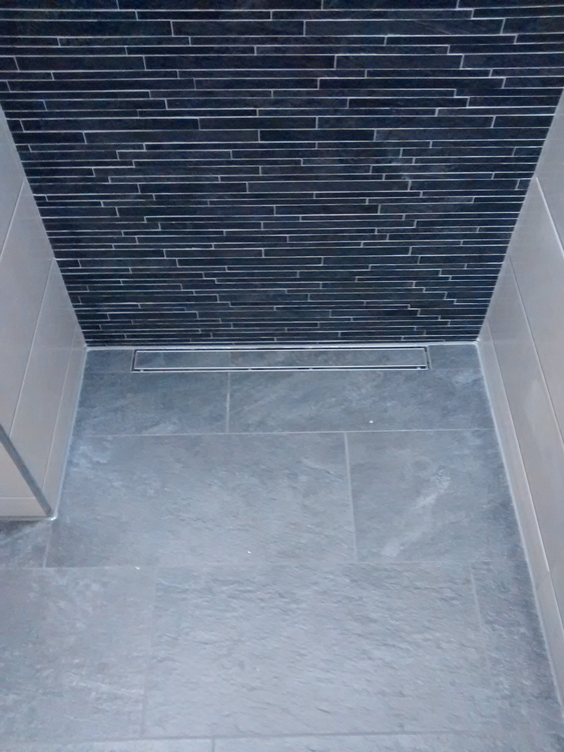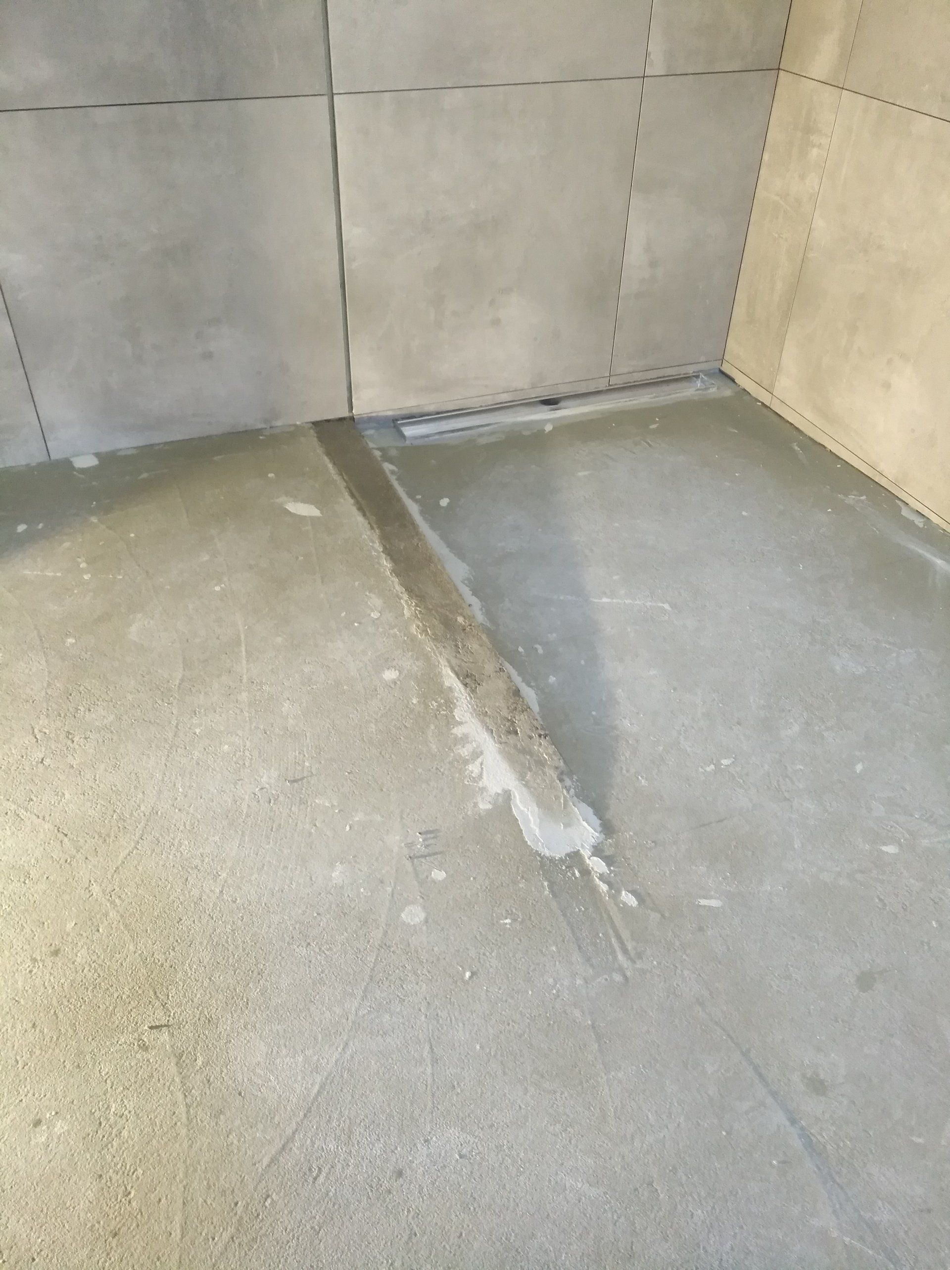 Bei diesem Bad reichte der Bodenaufbau nicht um die Duschrinne ebenerdig einzubauen.