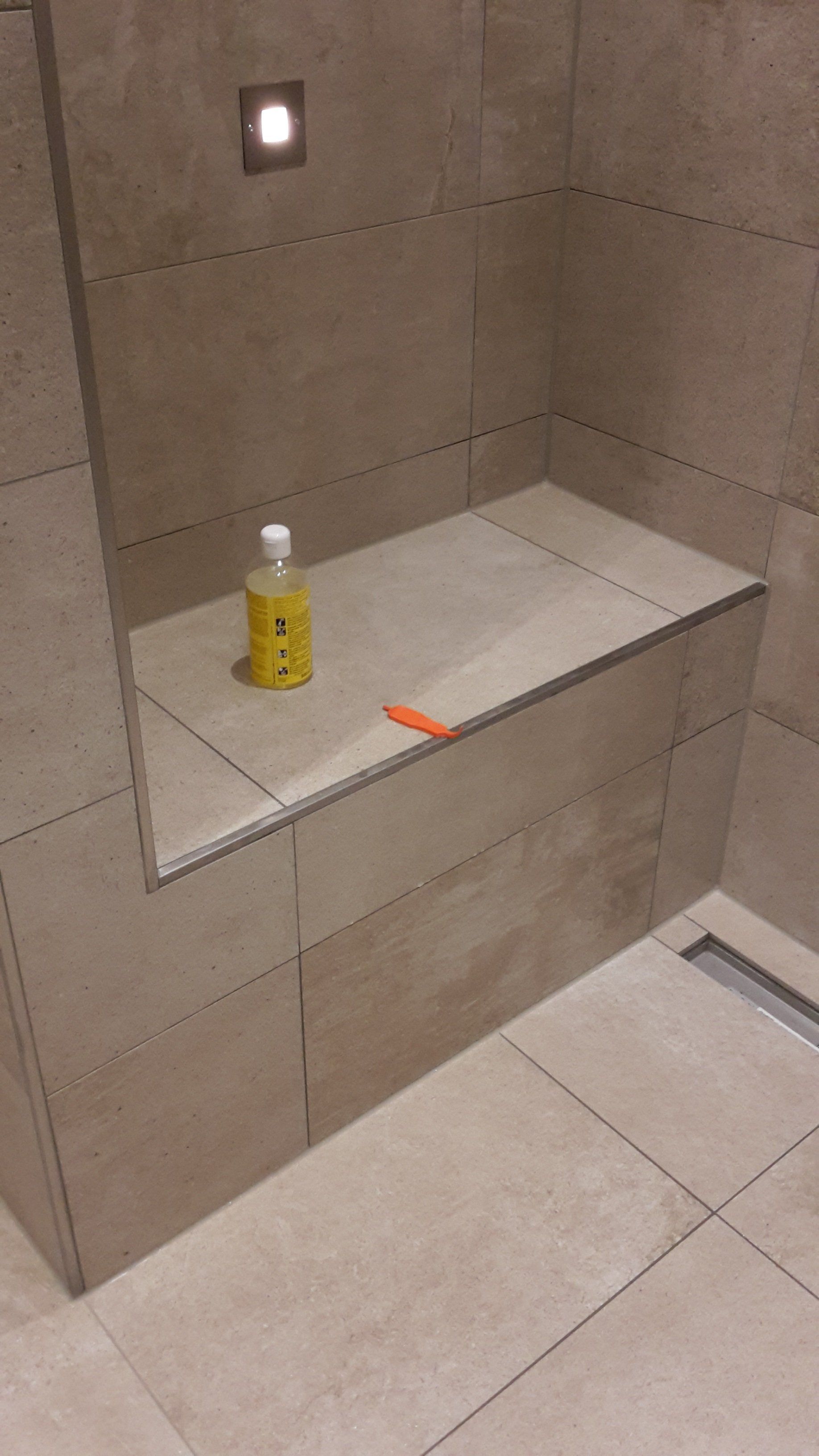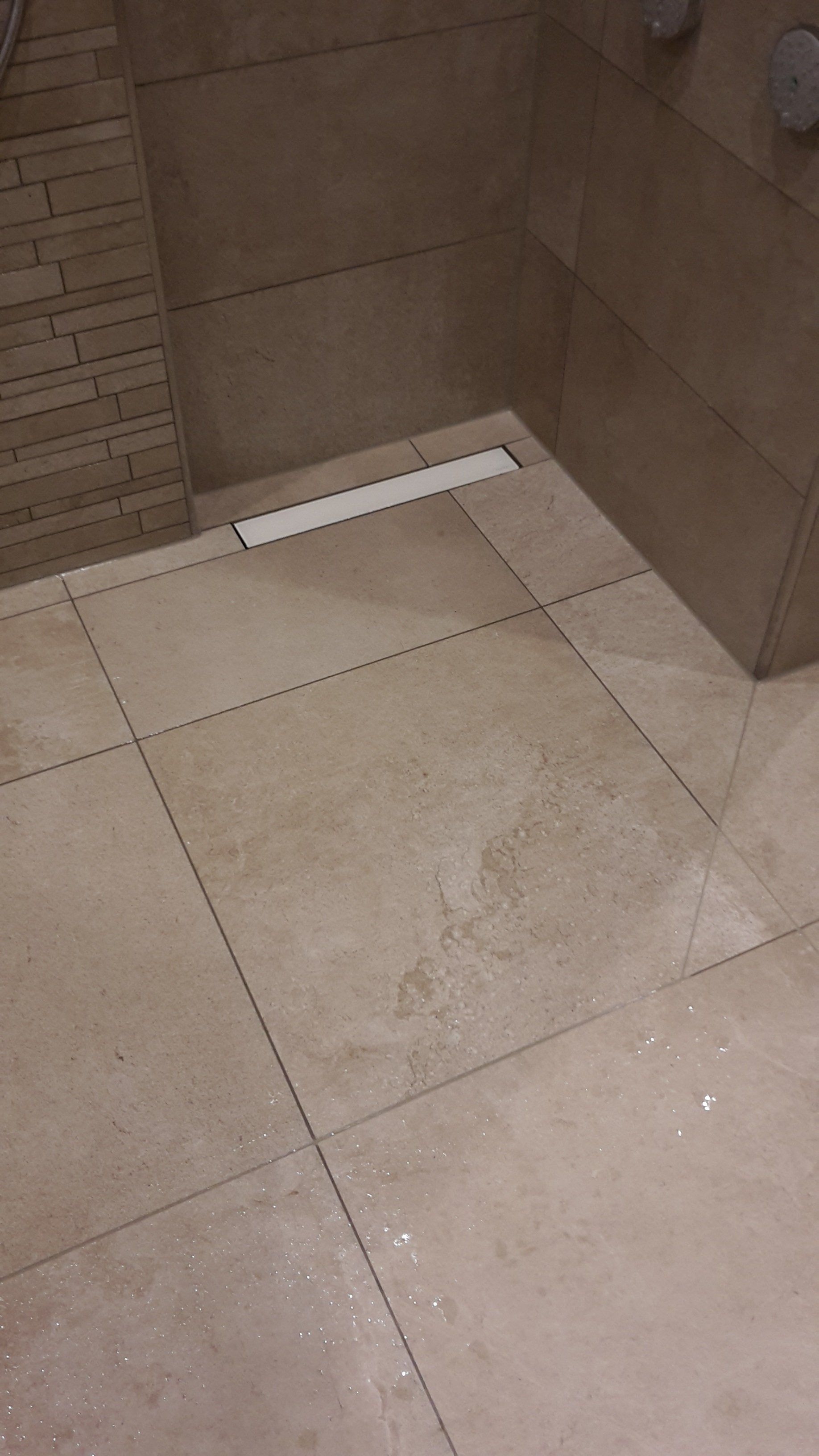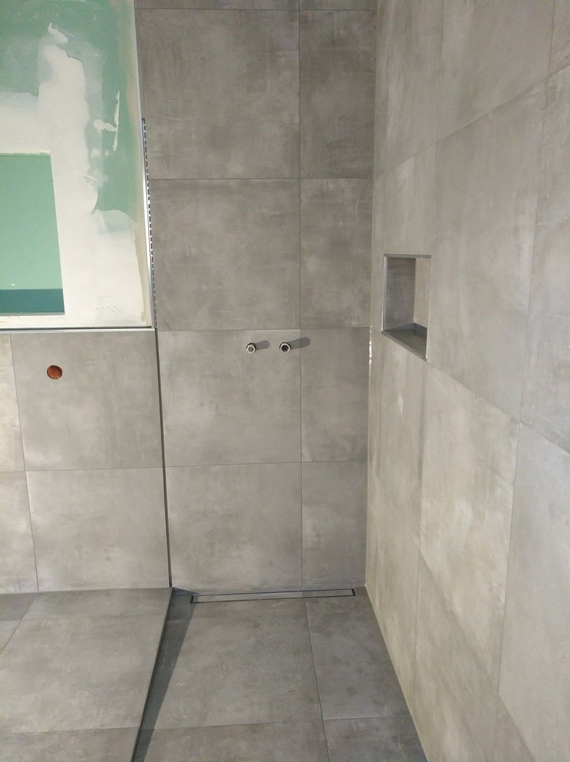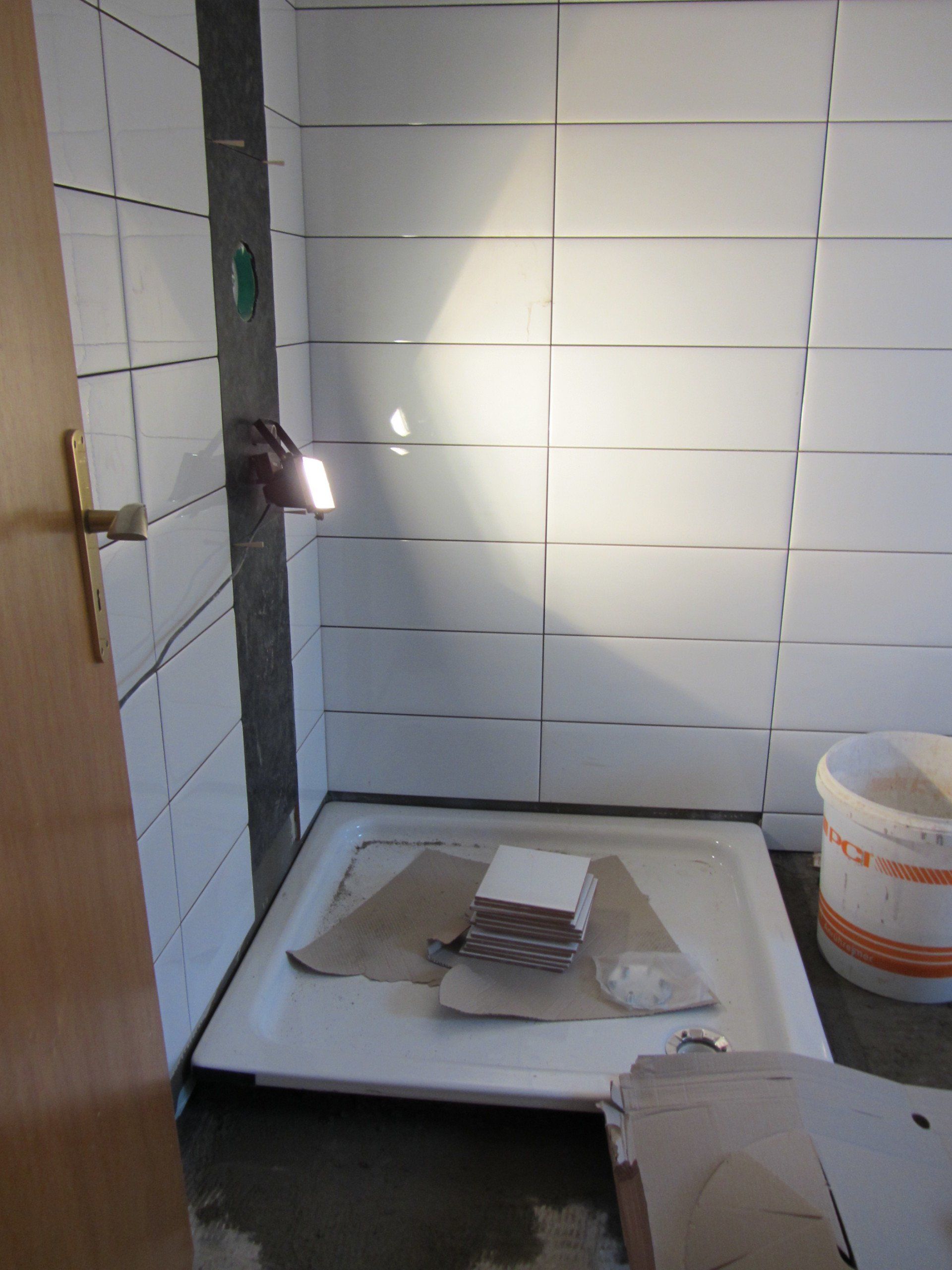 Bei diesem Bad reichte der Bodenaufbau nicht um die Duschrinne ebenerdig einzubauen.