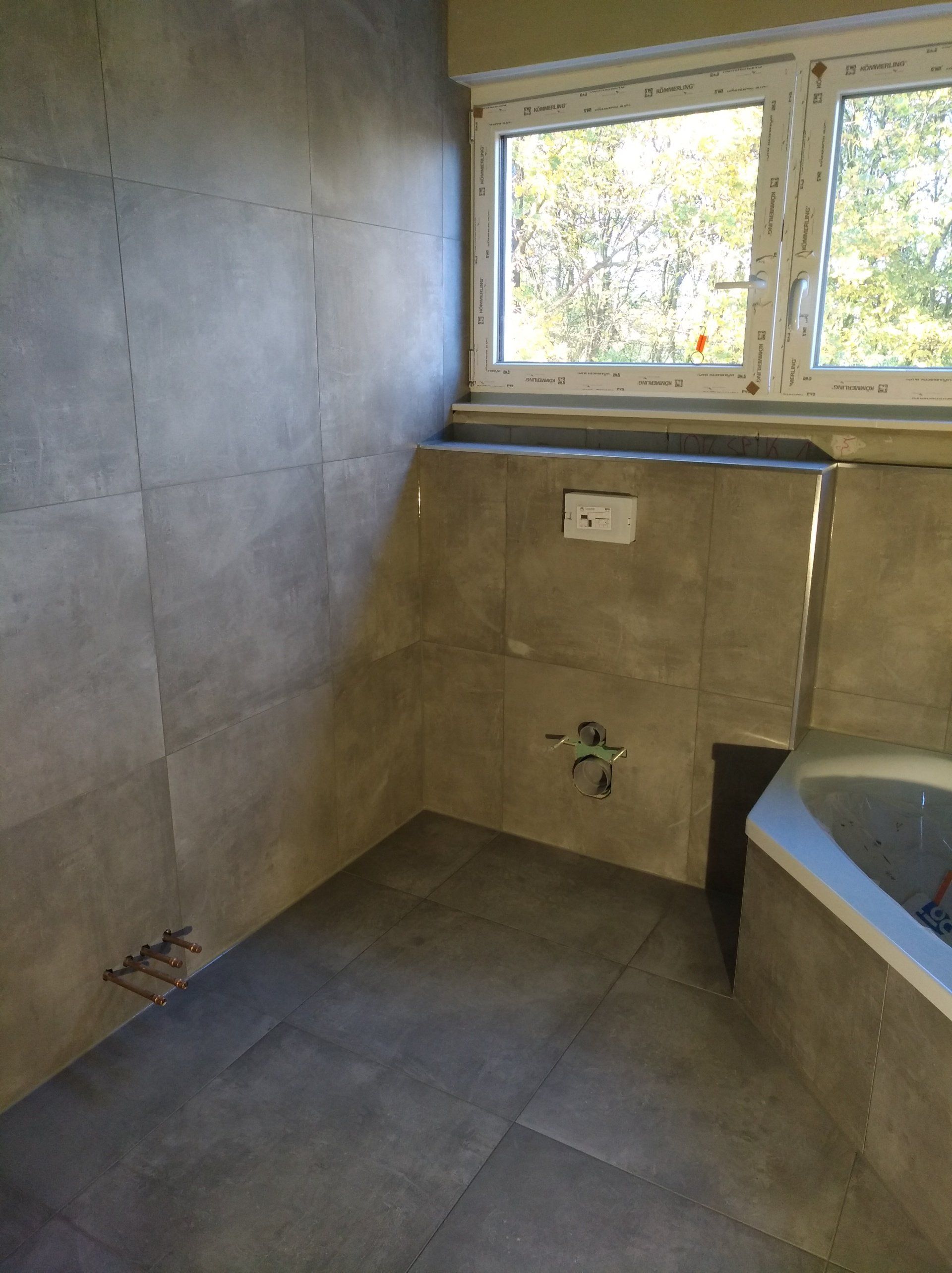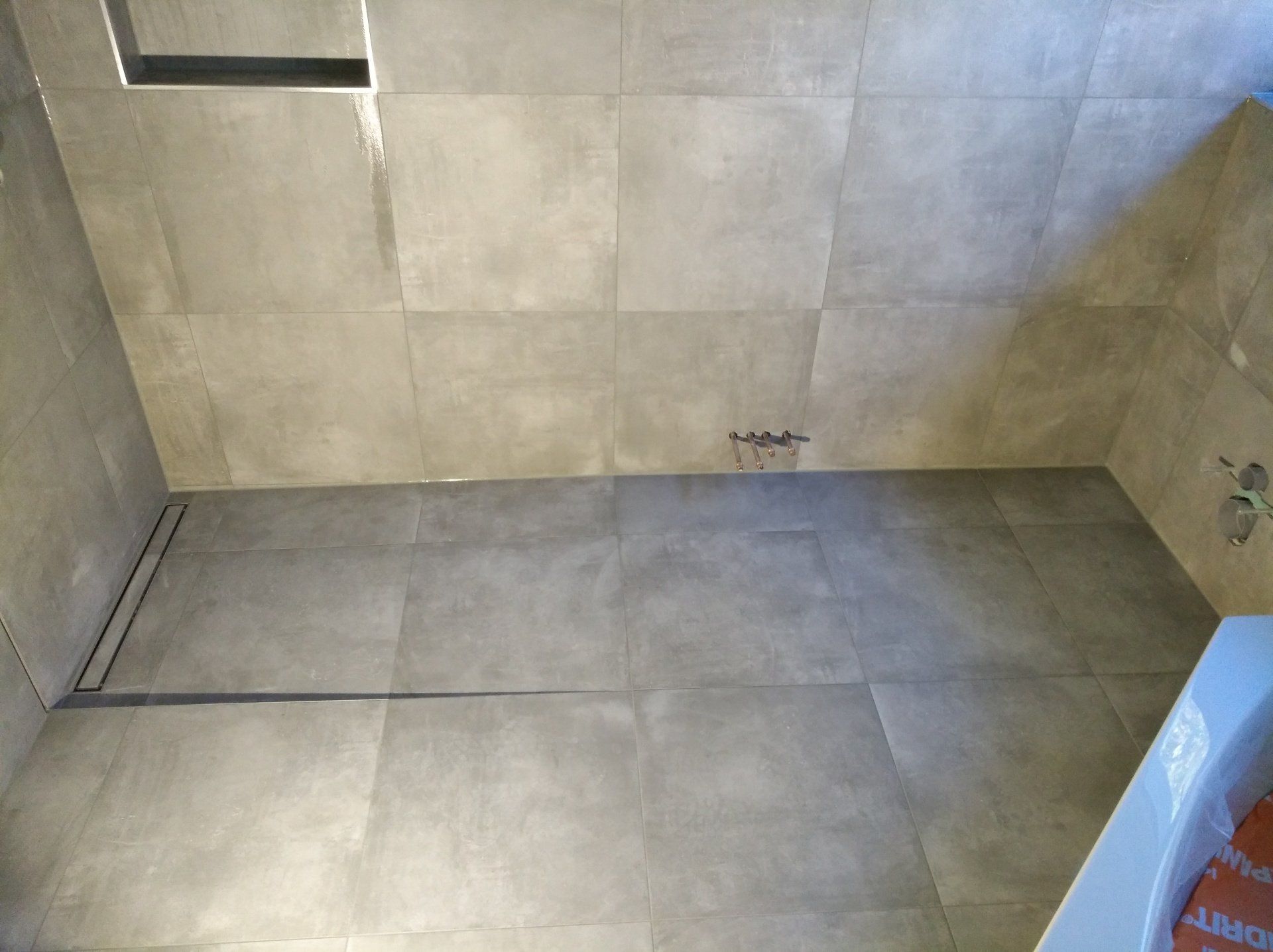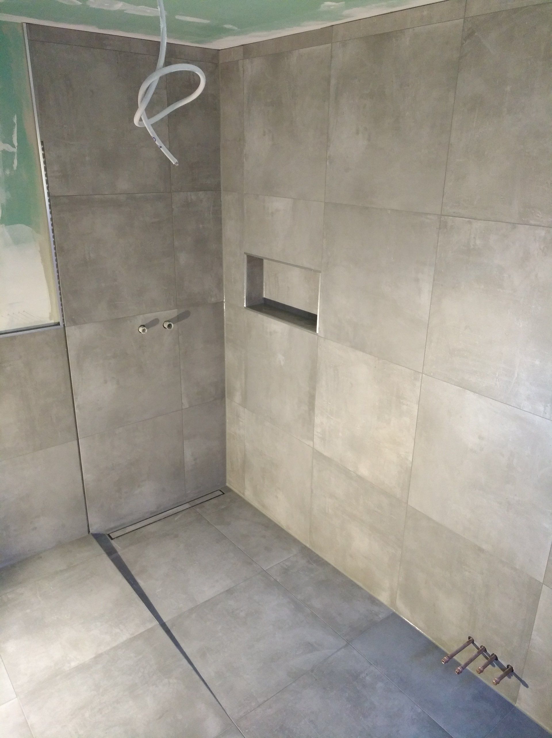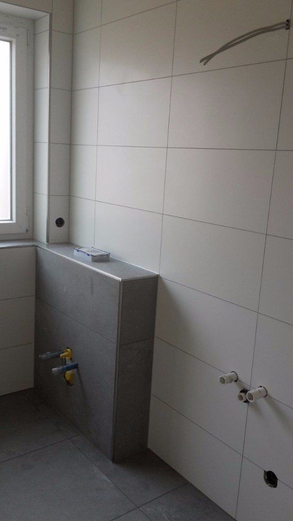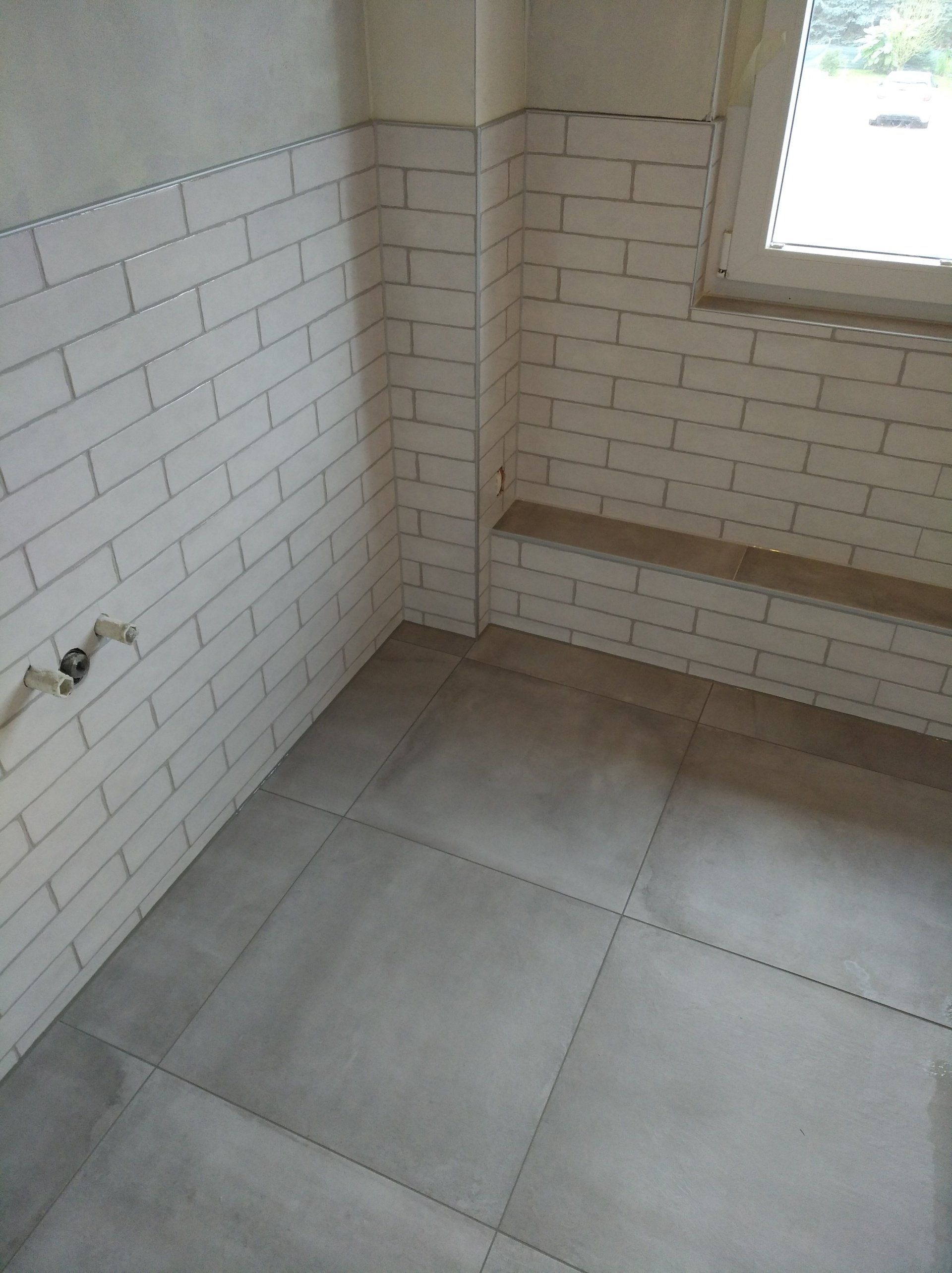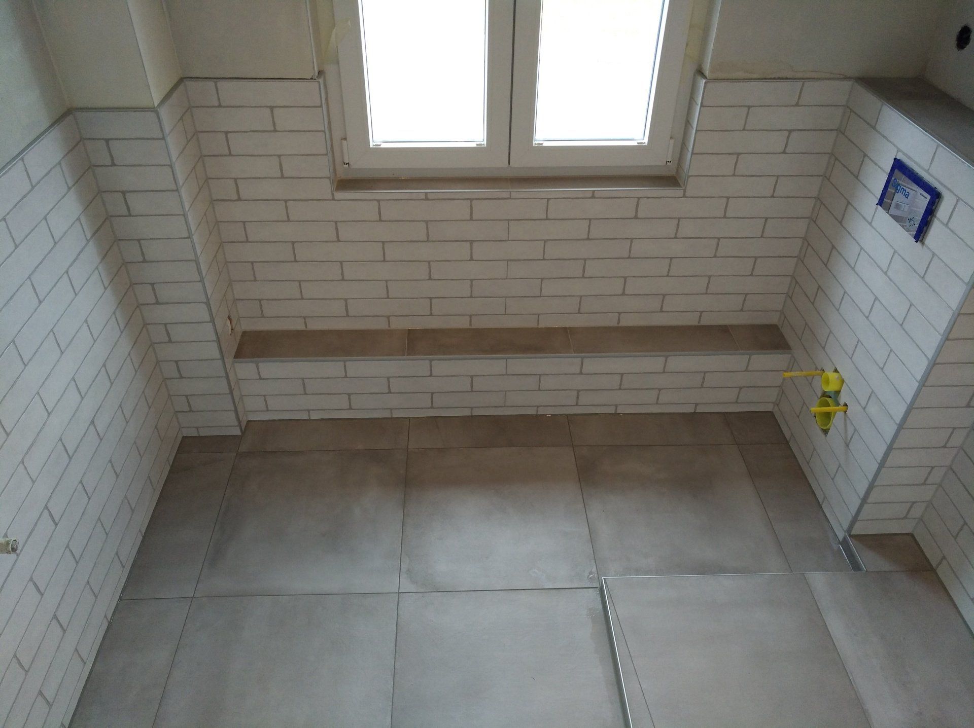 Badneubau mit 60x60cm Bodenfliesen an Wand und Boden im Fugenschnitt