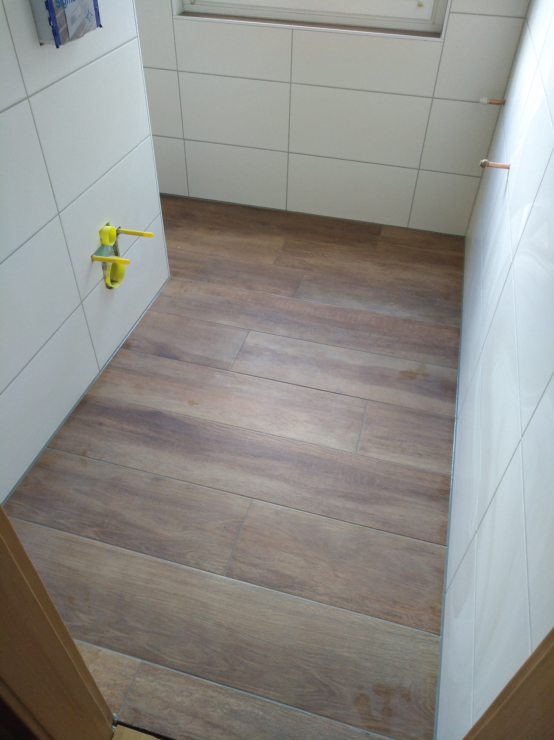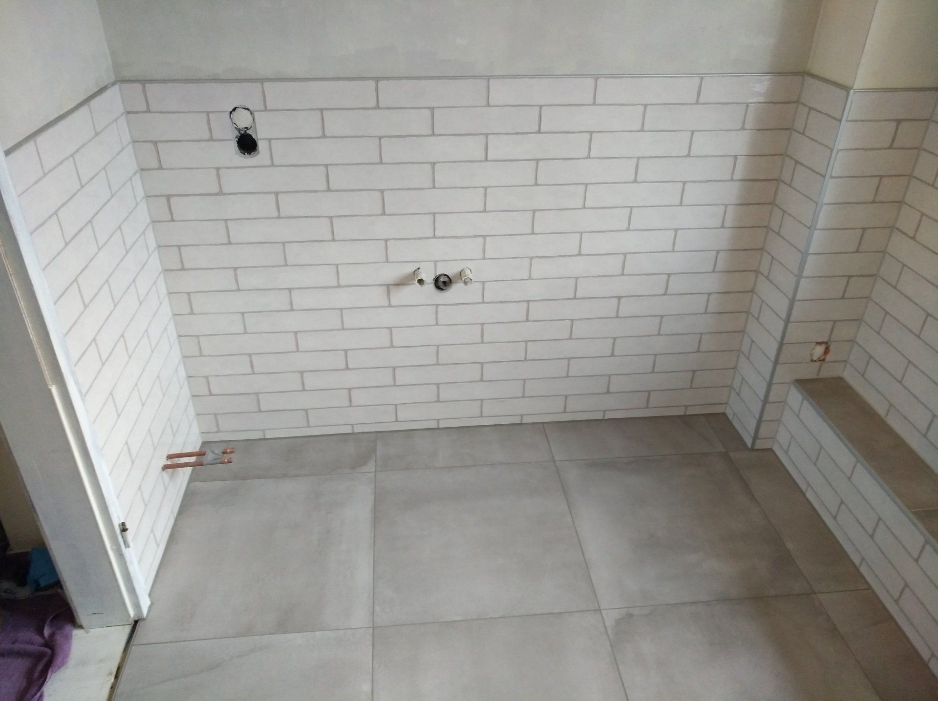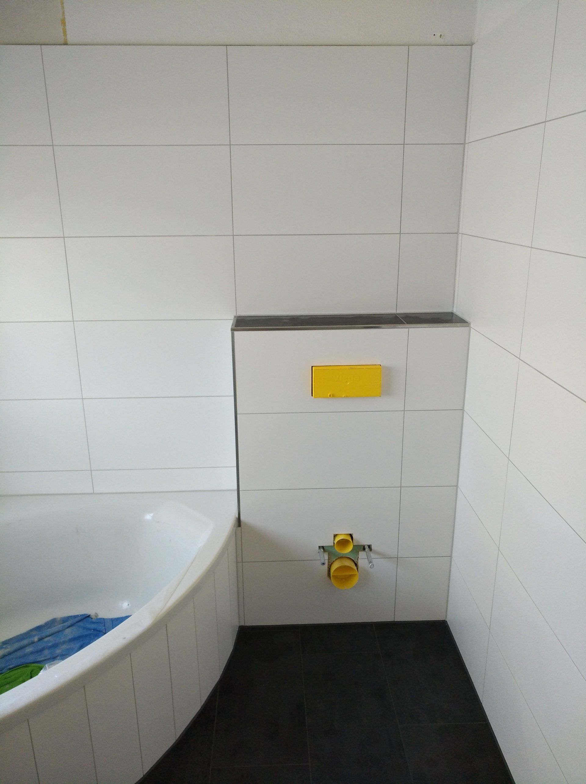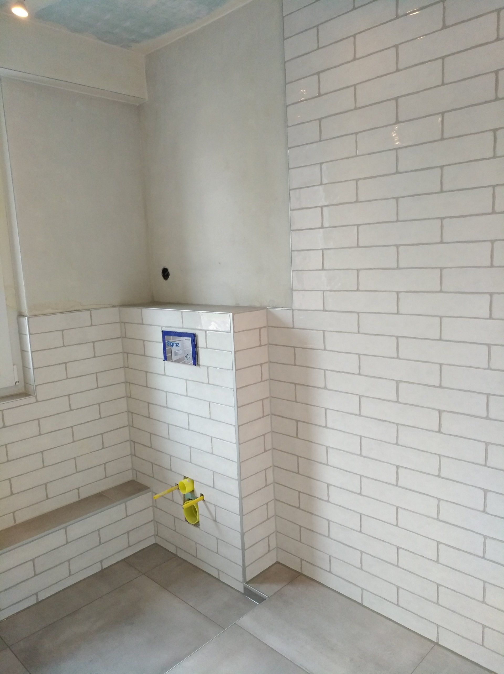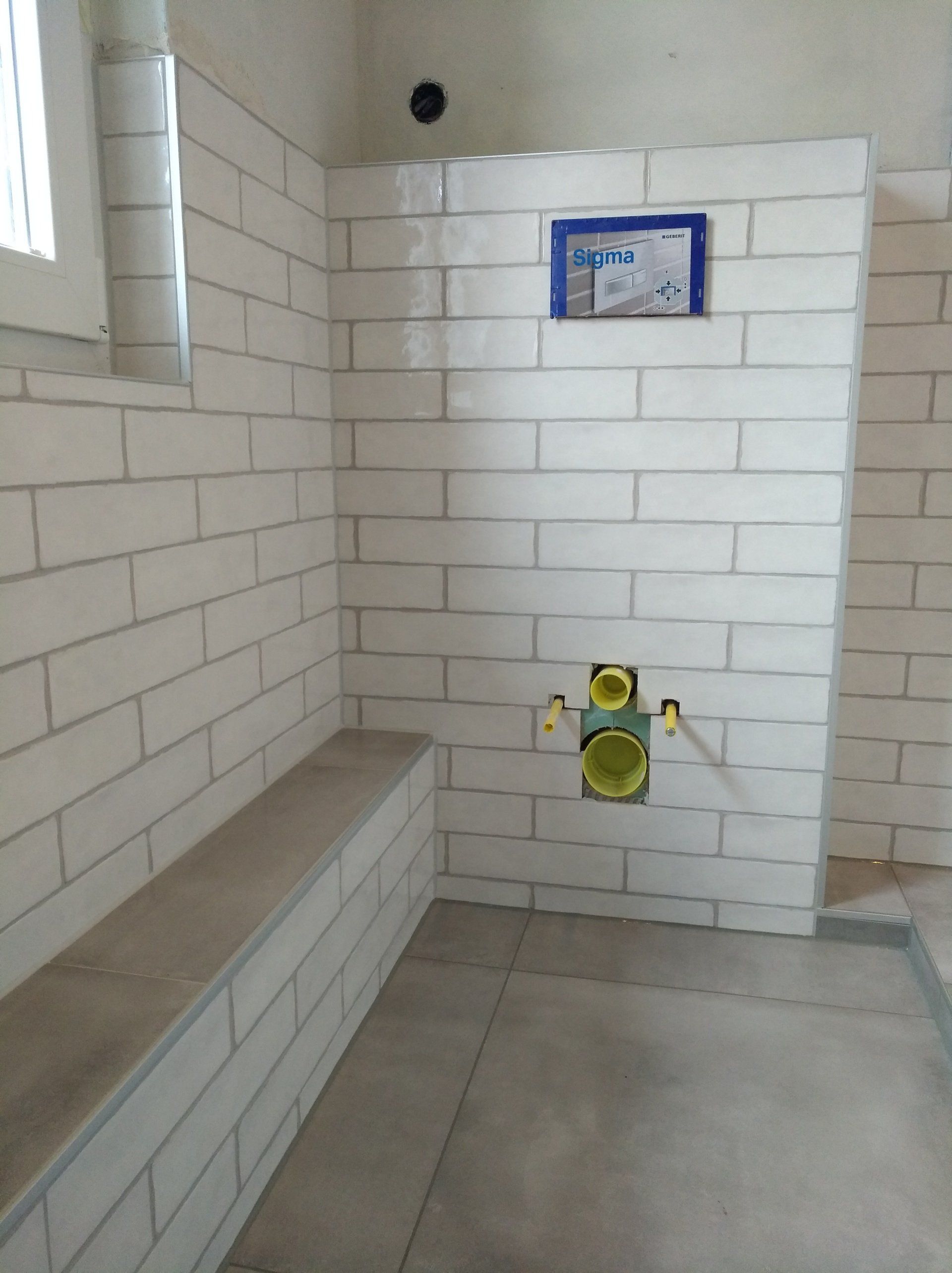 Badneubau mit 60x60cm Bodenfliesen an Wand und Boden im Fugenschnitt