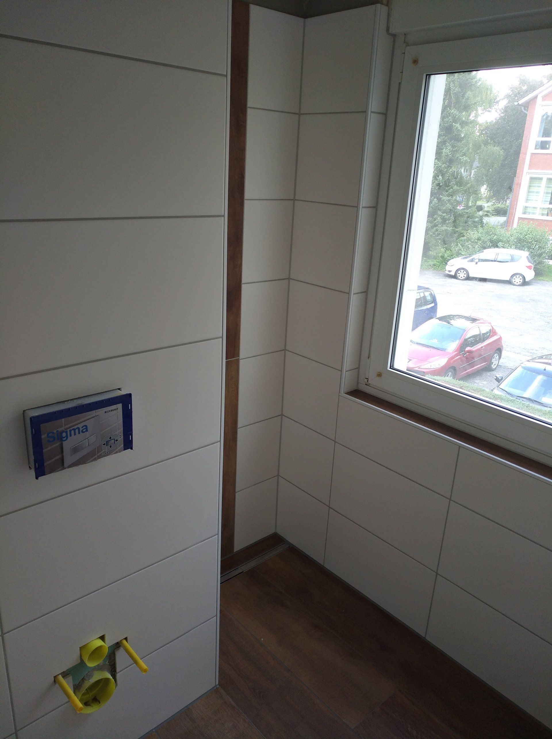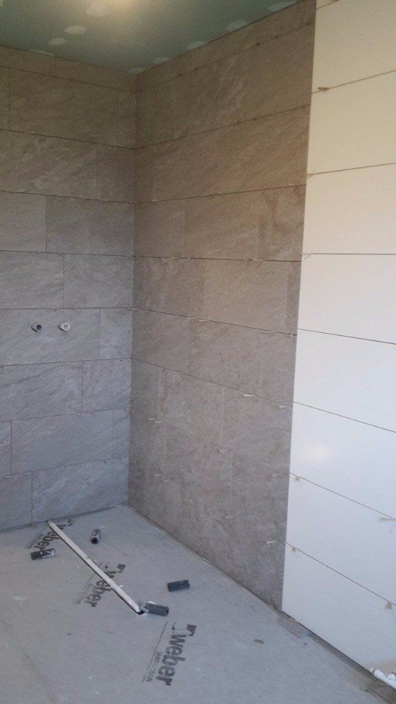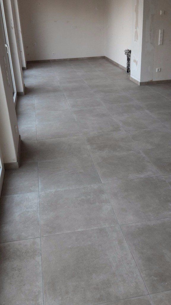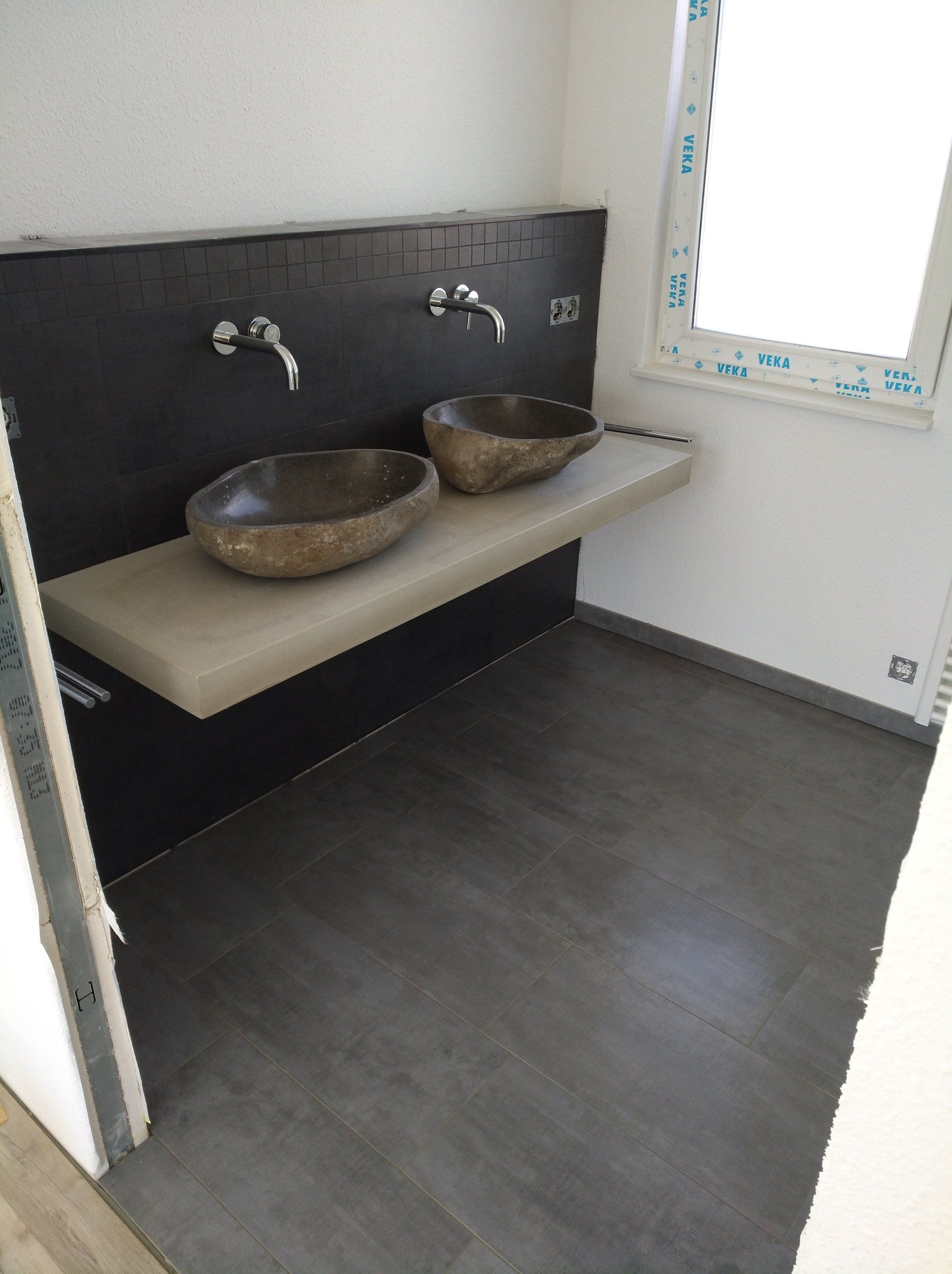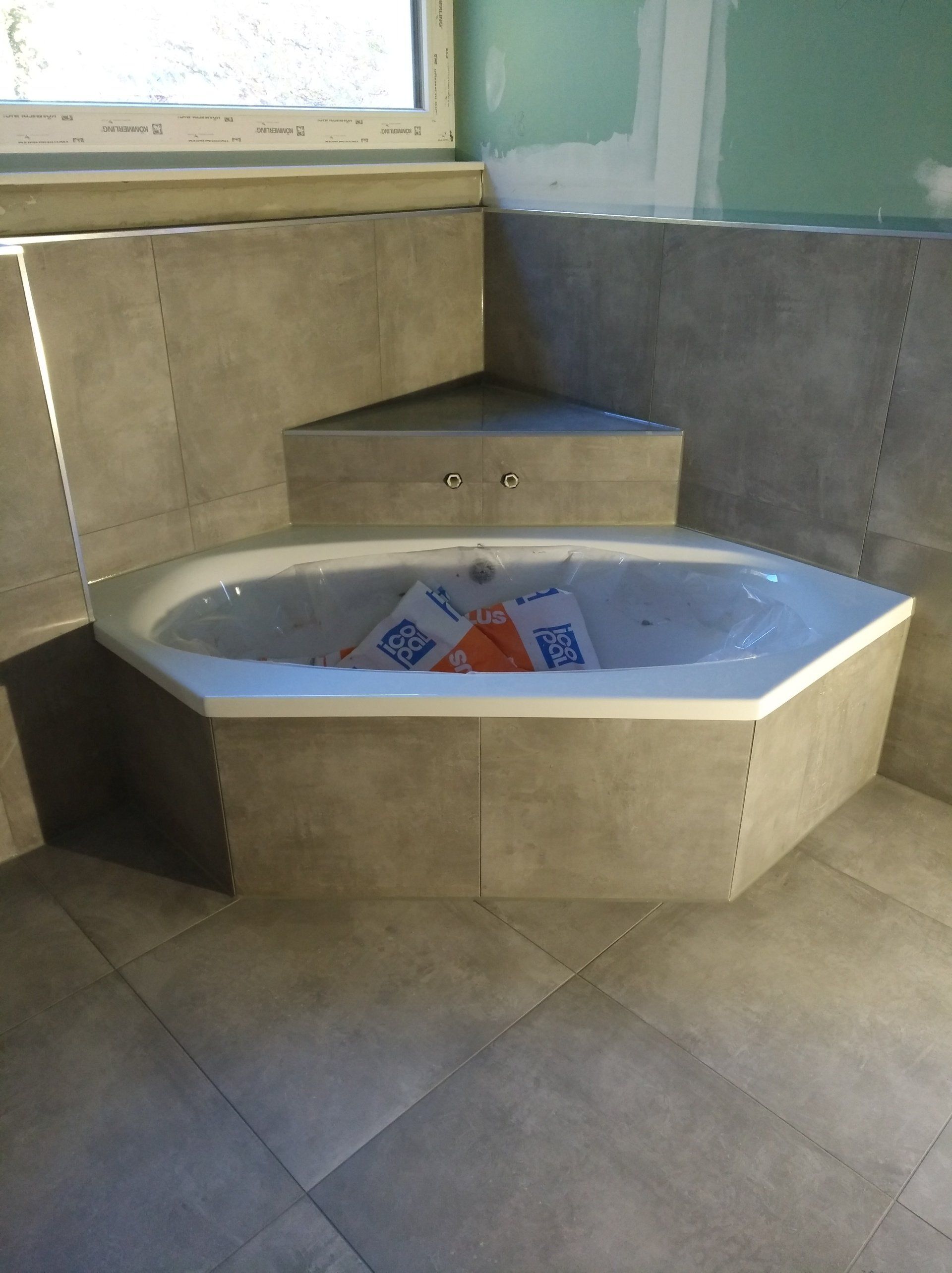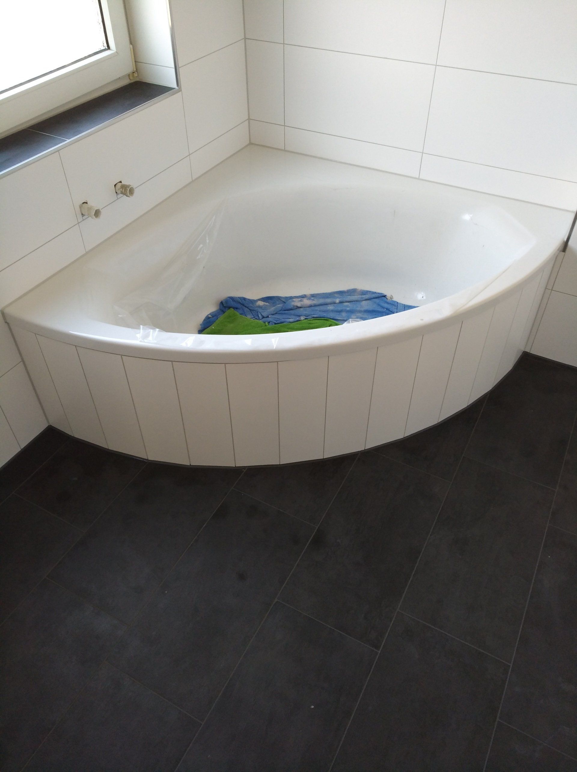 Badneubau mit 60x60cm Bodenfliesen an Wand und Boden im Fugenschnitt