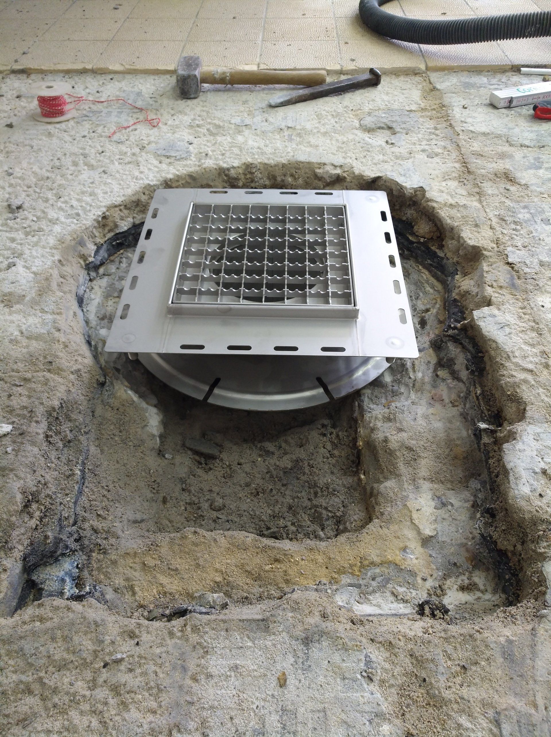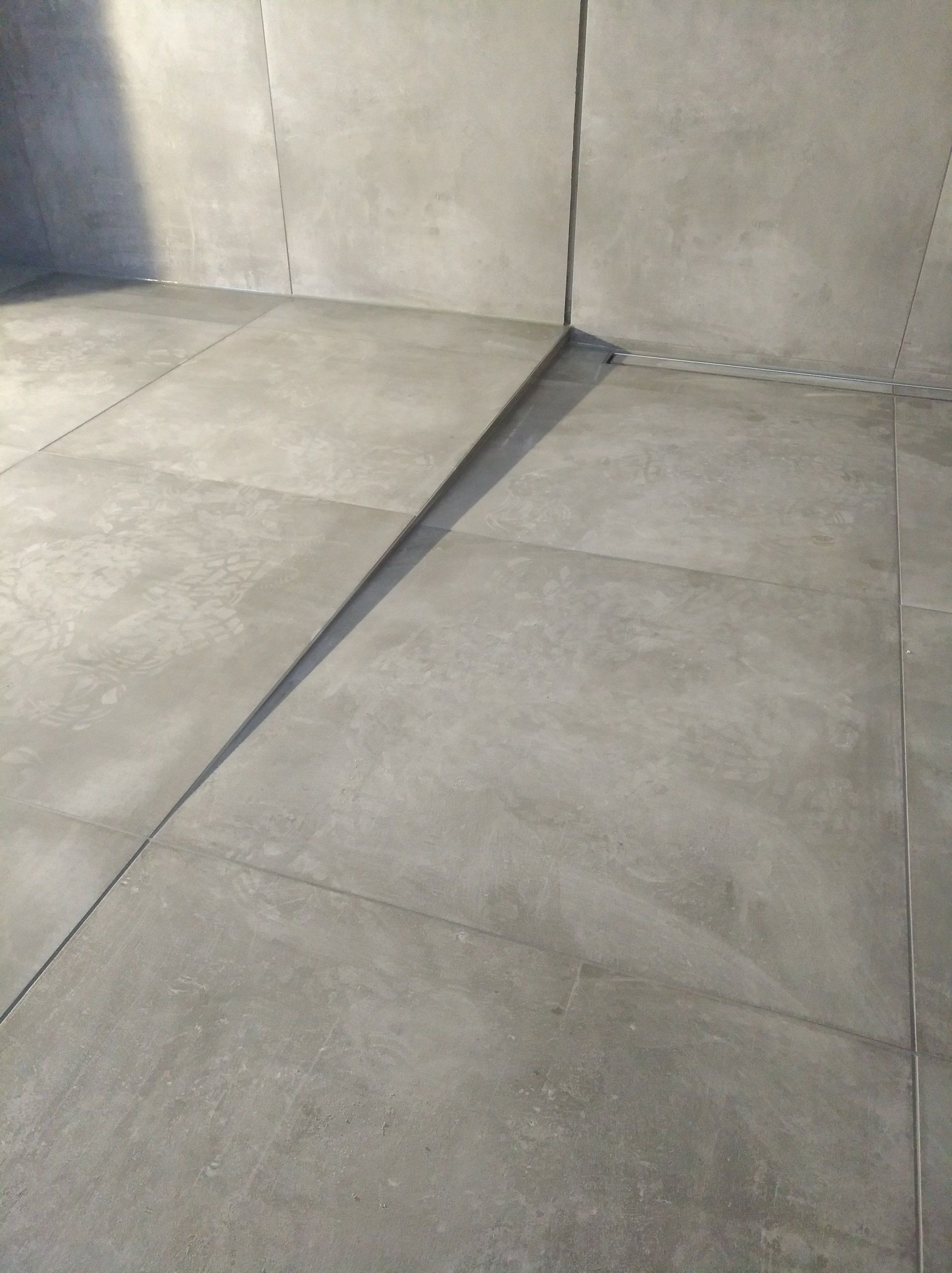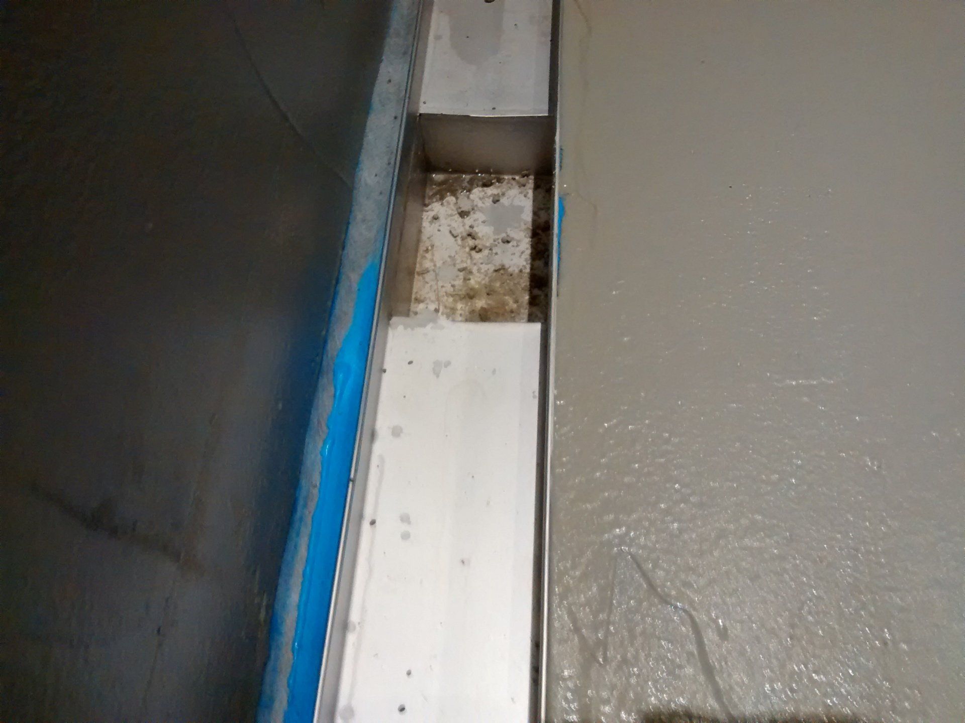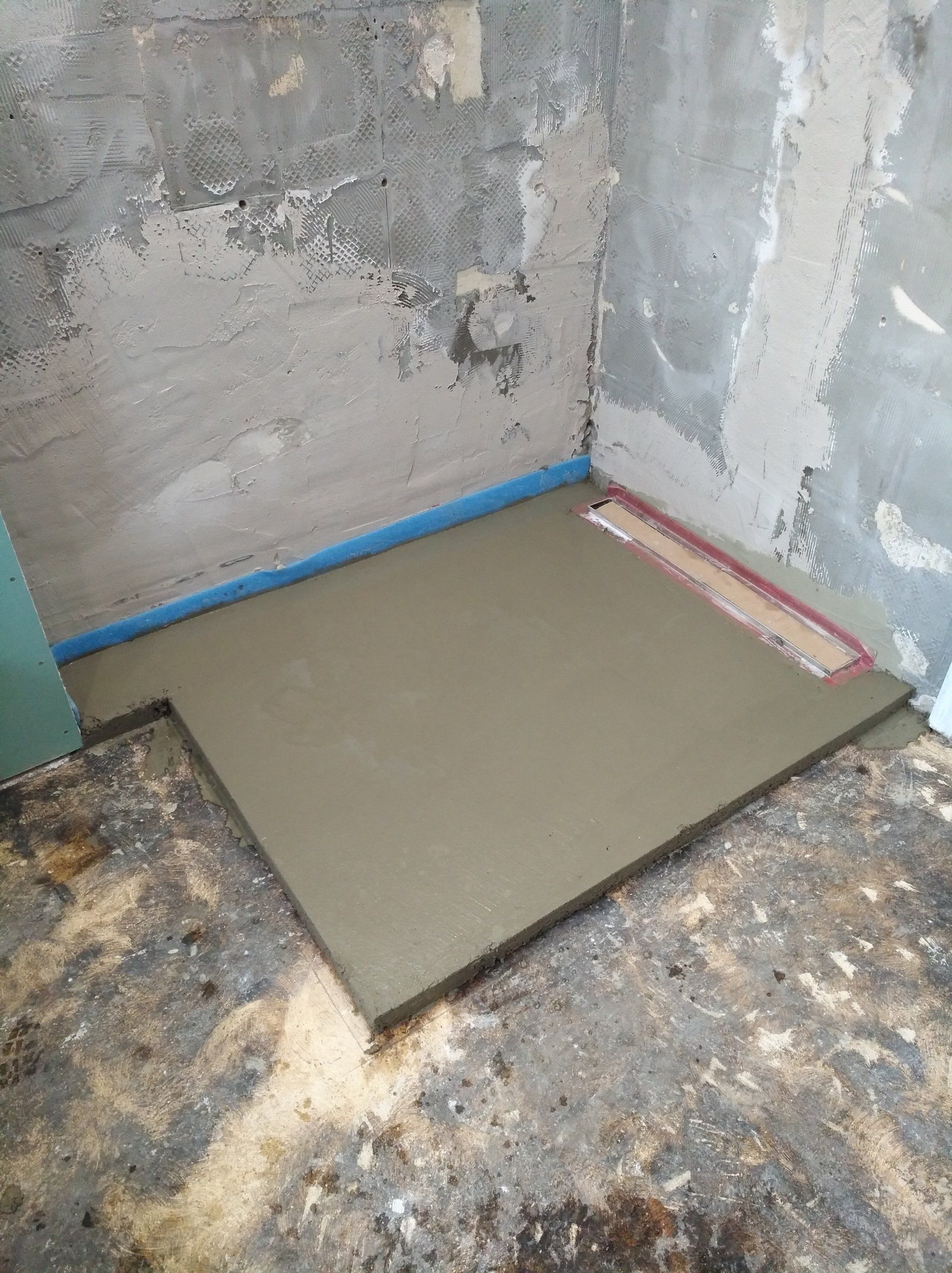 wurde die Rinne so tief wie möglich montiert und das benötigte Gefälle mittels eines Estrichs eingebracht.